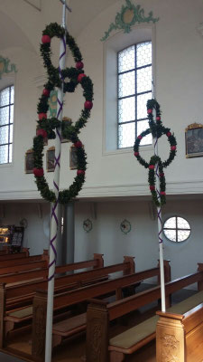 Dabei galt es die Blätter der Stechpalme von den Ästen zu trennen, in der Mitte vor zu lochen und sie danach an die Palmbäume zu stecken. Vor dem pieken der Stechpalme halfen natürlich Handschuhe weiter. Die fertiggestellten Palmbäume brachte die Klasse danach in die Kirche Geiss, wo sie gleich am Palmsonntag gebraucht wurden.