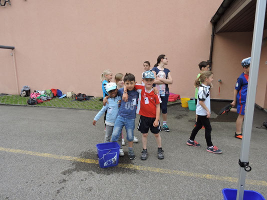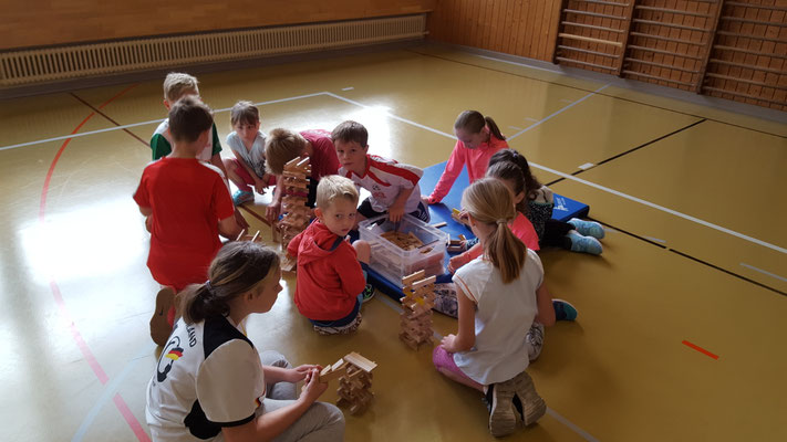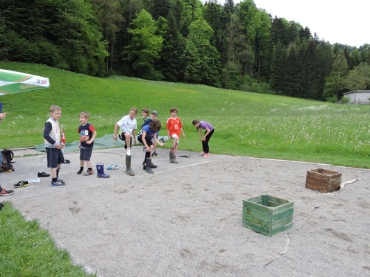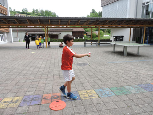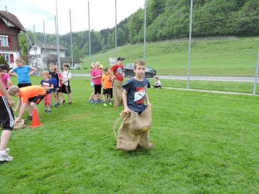 Am 18.05.2017 konnte der schulhausübergreifende Sporttag bei bedecktem Himmel aber ohne Regen stattfinden. In altersdurchmischten Gruppen, welche durch die 6. Klässler begleitet wurden, mussten sich die Gruppen in verschiedenen Disziplinen messen. So musste an einem Posten ein Ei balanciert werden, ein Eimer getroffen werden und zudem ein Kaplaturm gebaut werden, bevor der nächste an die Reihe kam. Bei der einen Wasserstafette transportierten die Kinder Wasser mit Trinkhalmen, bei der anderen einen Becher voll mit Wasser durch Hindernisse. Kraft bewiesen die grösseren Schülerinnen und Schüler beim Paarlauf, indem sie kleinere Kinder trugen, welche kleine Hüte über grosse Markierkegel legten. Auch Stiefel flogen durch die Luft - Ziel war dort den Stiefel in eine Kiste zu treffen. Beim Blachentransport durften sich die Lernenden nur auf den Blachen fortbewegen. In weiteren Stafetten wie dem Lottolauf und dem Geschicklichkeitslauf war Schnelligkeit und Glück gefragt. Das Sackhüpfen auf dem Rasenplatz machte allen sichtlich Spass. In der Turnhalle ging es bei einer Stafette um den höchsten Kaplaturm, der jeweils gegen Schluss sehr ins Wanken geriet.