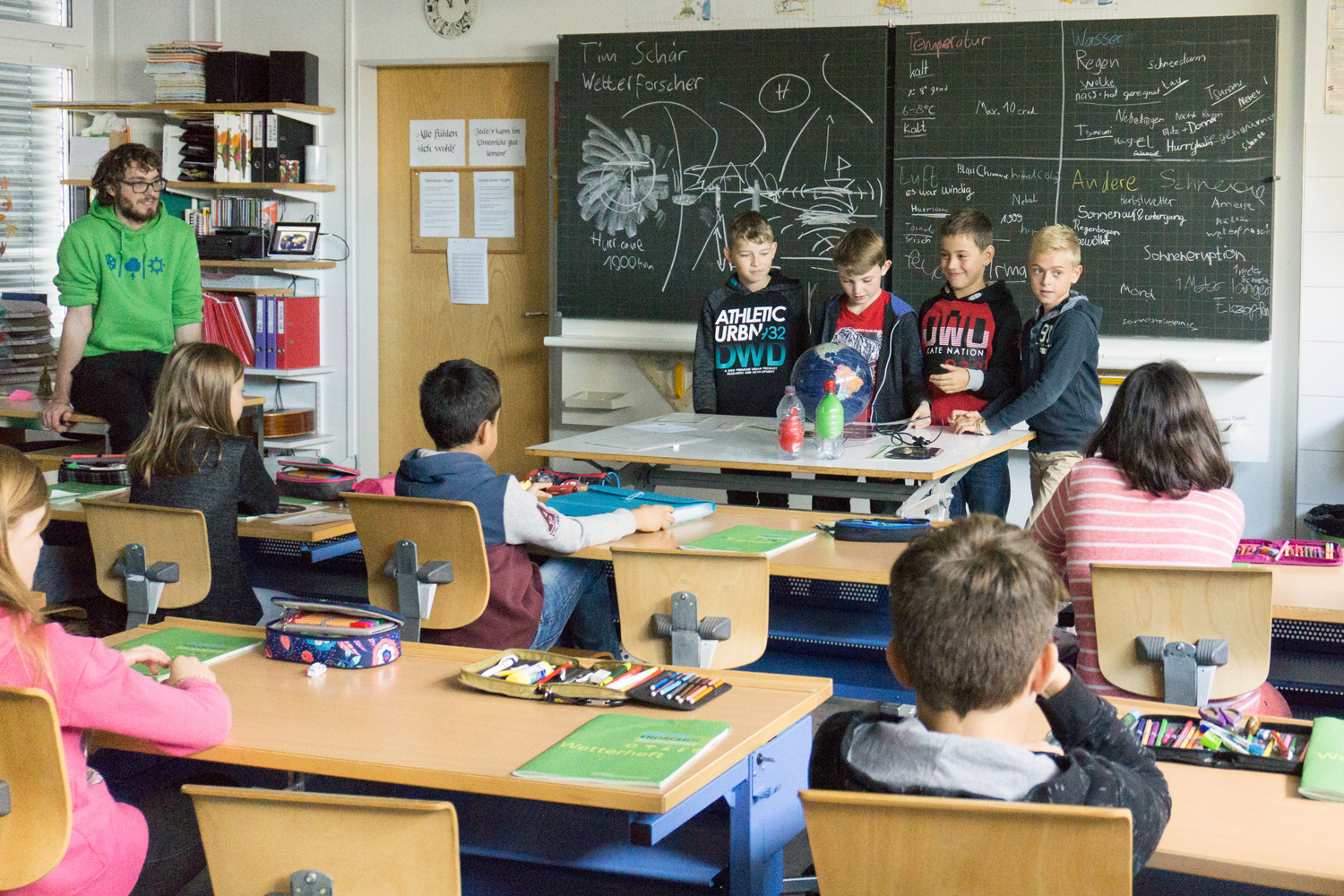 Die zwei Experten brachten den Schülerinnen und Schülern das Thema Wetter, Klima und Naturgefahren etwas näher, indem sie mit ihnen Wetter fühlten und beobachteten, bereits bekannte Wetterphänomene sammelten und diskutierten, ein Experiment durchführten und kleine Aufgaben stellten. Ausserdem brachten die zwei eine grosse Forscherkiste mit in die Schule, welche nun in den nächsten Wochen in der Klasse bleibt und den Schülerinnen und Schülern ermöglicht mit ihrer Lehrerin weitere Experimente und Wetterbeobachtungen zu machen.