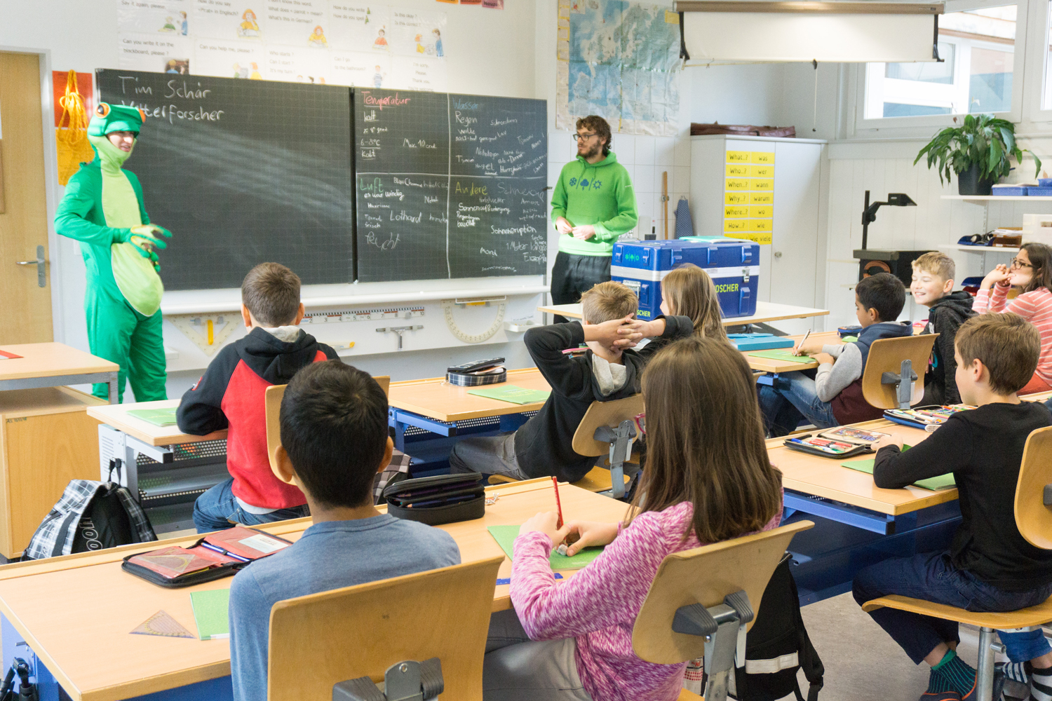 Am 30. Oktober bekamen die 5. Klässler von Monika Reis Besuch vom Wetterfrosch und dem Wetterforscher Tim Schär.