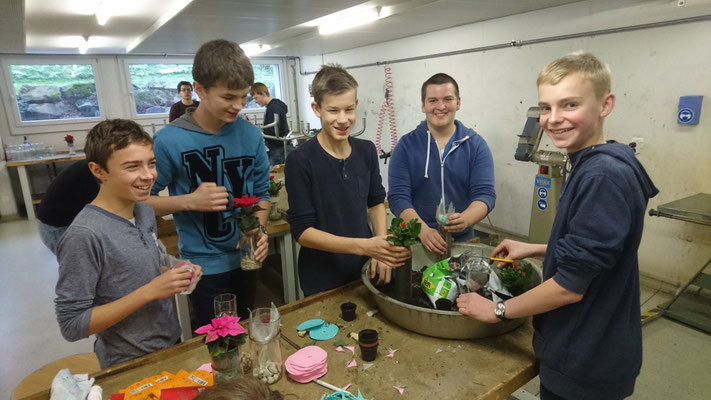 Mit viel Engagement haben wir von der 3. Sek. am Adventsanlass teilgenommen. Als Projekt, welches zum Schuljahresmotto „Güsel i Chöbel“ passt, haben wir uns entschlossen Abfall zu veredlen. Upcycling heisst der Fachbegriff. Aus Weinflaschen haben wir selbsttränkende Blumentöpfe hergestellt.