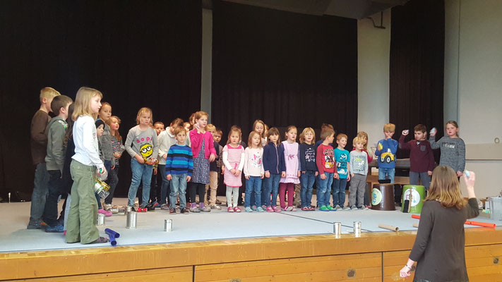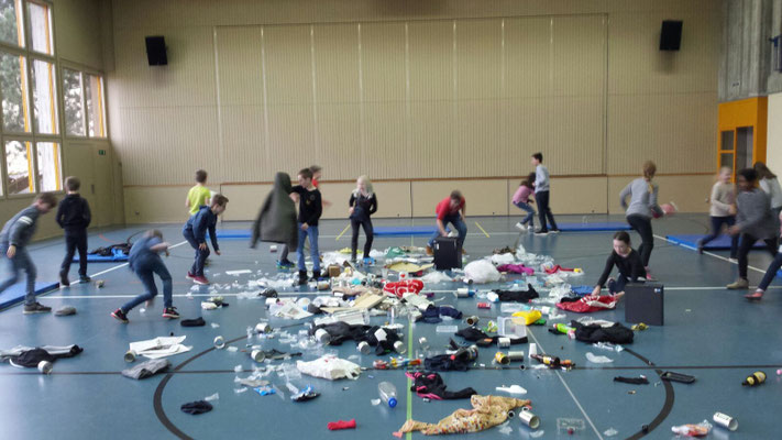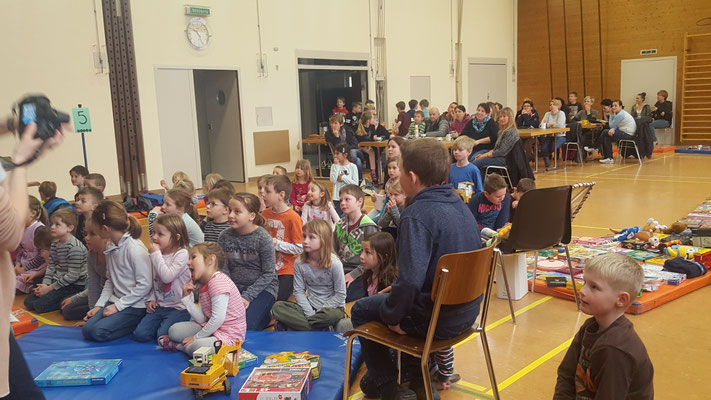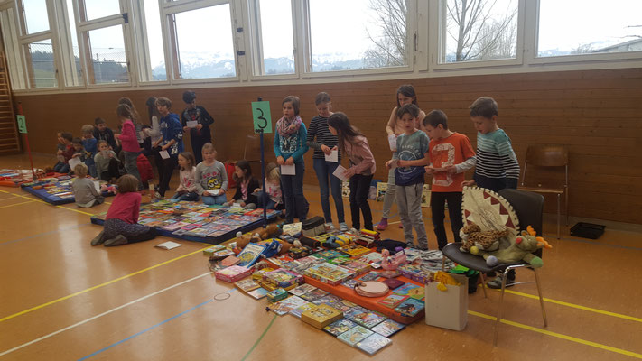 Die 5./6. Klasse begrüsste in Geiss die Besucherinnen und Besucher zu ihrem ersten Teil dem musikalischen Unterhaltungsprogramm. Sie begannen mit dem Song „Turn the world around“. Aramsamsam sang danach die 3./4. Klasse gefolgt von ihrem Recyclingsong. Nachdem die Schülerinnen der 1./2. Klasse ein Recyclinggedicht zum Besten gaben, liessen die Kinder von Kindergarten bis zur 2. Klasse Flaschen, Büchsen, Röhren, Rasseln melodisch erklingen. Am Schluss gab es einen Güsel-Stomp. Im zweiten Teil fand der Tauschplausch statt. Die Schülerinnen und Schüler hatten vorgängig Bücher, Spiele, Kleider, Plüschtiere und vieles mehr mitgenommen, um es gegen andere Gegenstände einzutauschen.