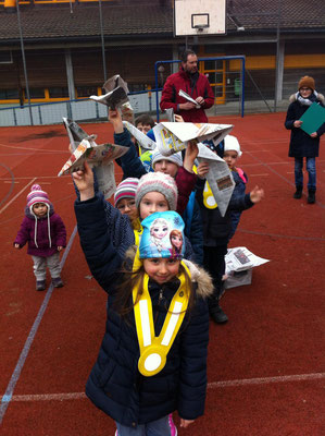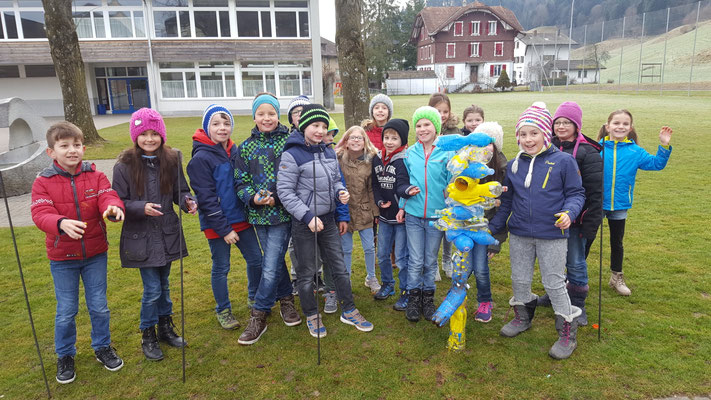 In Menznau waren der Kindergarten und die 1.-5. Klasse auf einem Postenlauf unterwegs. Die Eltern hatten die Möglichkeit entweder die Klasse zu begleiten oder als Einzelkämpfer teilzunehmen. Die Schülerinnen und Schüler der 6. Klasse betreuten die sechs Posten auf dem Schulhaus- und Rickenareal. Am Posten erhielten die Klassen die entsprechende Anweisung für die zu lösende Aufgabe. Mit dem Fingerabdruck malten die Schülerinnen und Schüler das neue Schülerratslogo. In der Rickenhalle musste der Müll feinsäuberlich getrennt werden. Auf dem roten Platz falteten die Kinder aus Zeitungspapier Flieger und liessen sie gleiten. Batterien dienten als Wurfgeschoss auf dem Schulhausareal. Mit den mitgebrachten PET-Flaschen erstellten die Klassen beim Gemeindehaus kreative Stehlen. In der Bibliothek probierten die Schülerinnen und Schüler die richtige Antwort auf ein paar Quizfragen zu finden. Als Sieger, wer hätte das gedacht, konnten die Jüngsten überzeugen. Gewinner des Postenlaufs war der Kindergarten 2. Herzliche Gratulation.