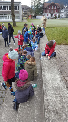 Im Schulhaus Menzberg präsentierten die Basisstufe und die 3.-6. Klasse den selbstgedichteten Güsel-Rap zur Melodie von „We will rock you“ in der Eingangshalle. Der Anlass war gut besucht. Die Besucher konnten in der Kaffee-Ecke ihrer Kreativität freien Lauf lassen, indem sie mithalfen ein Bild mit Abfallmaterial zu gestalten.