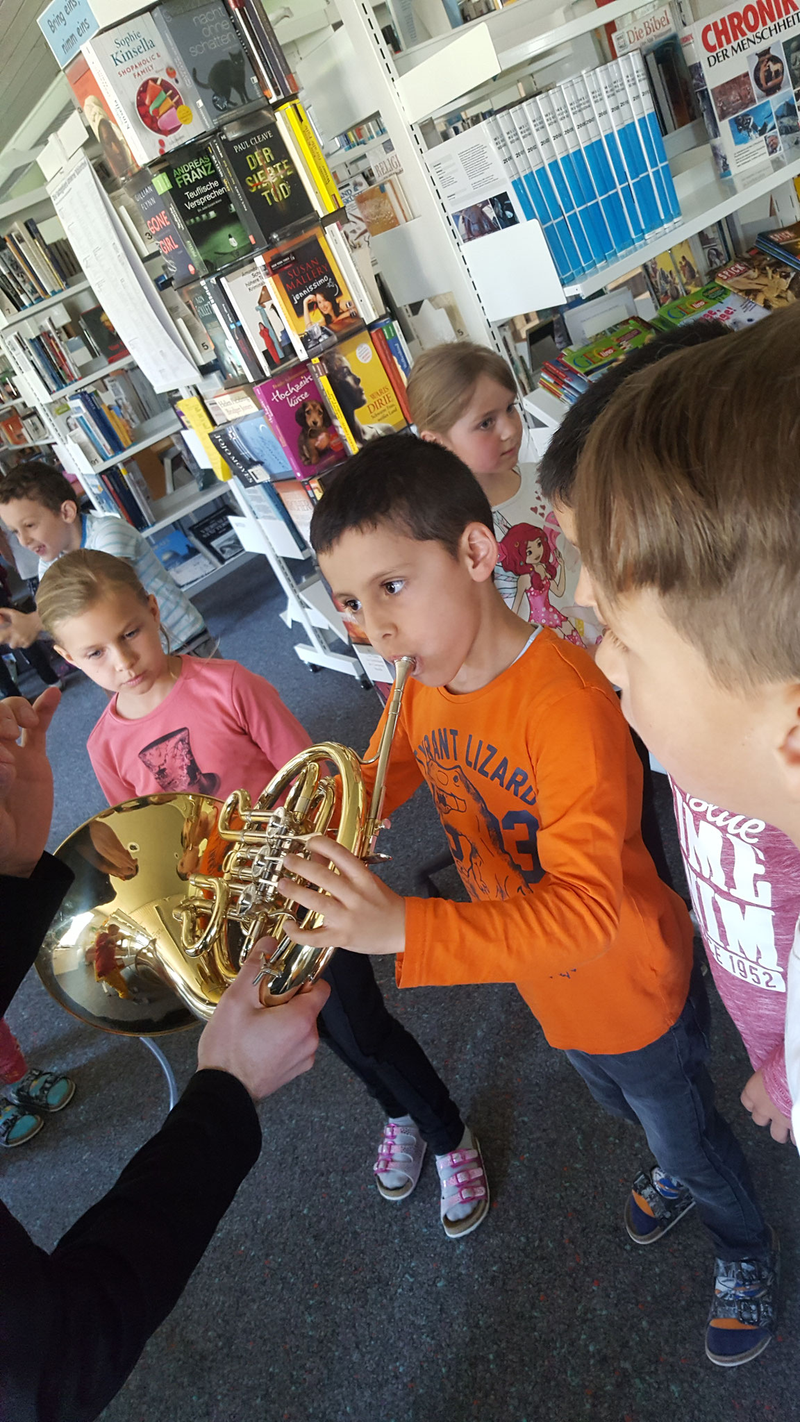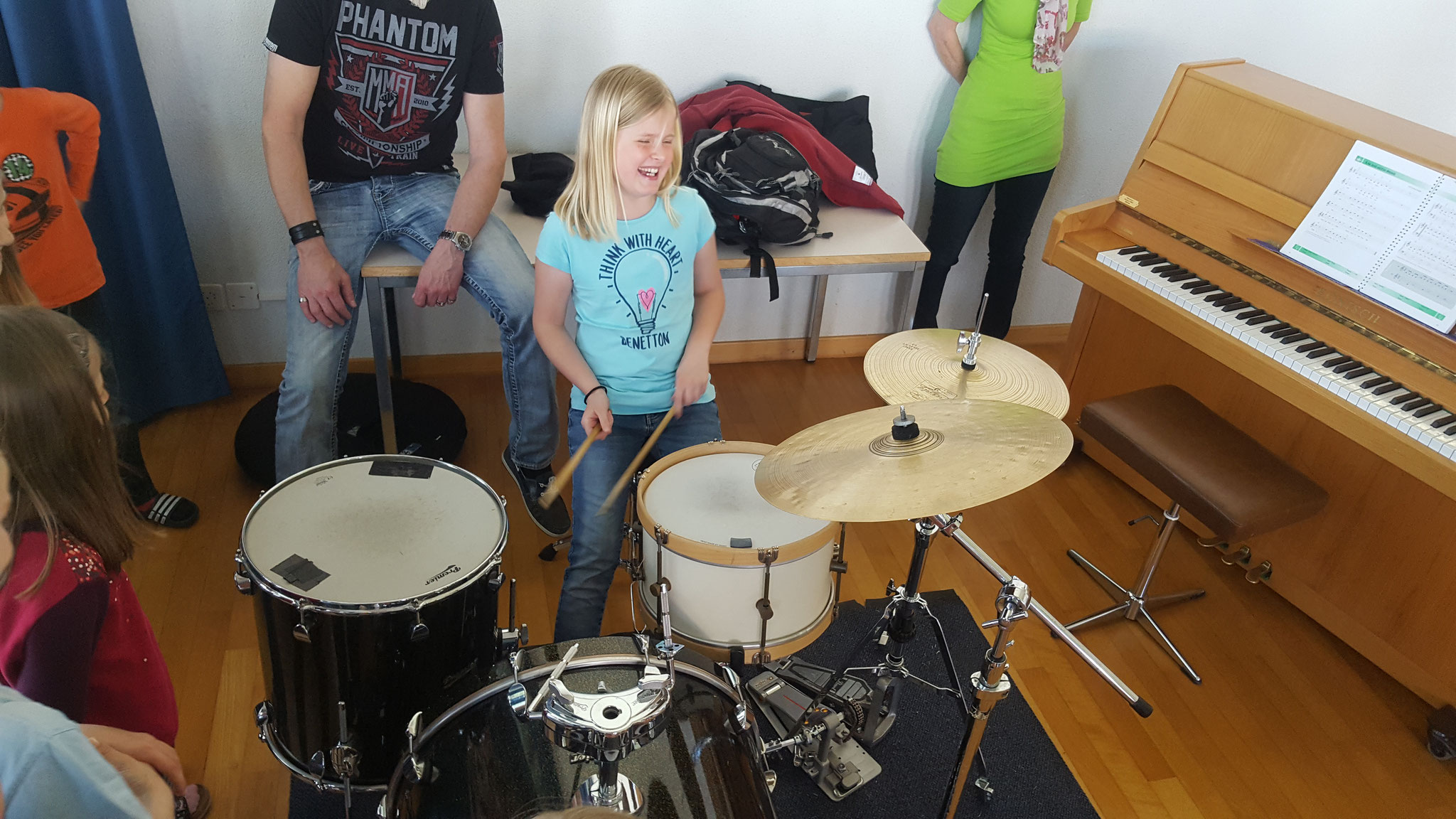 Die Schülerinnen und Schüler liessen sich mitreissen und klatschten im Takt mit. Sie applaudierten und jubelten nach jedem Stück. Die Musikschullehrpersonen verteilten sich danach in verschiedene Räume. Die Lernenden teilten sich in Gruppen und konnten die Instrumente ausprobieren. Die Musikschullehrpersonen unterstützen die zukünftigen Musikerinnen und Musiker und gaben wertvolle Tipps im Umgang mit Keyboard, Klavier, Schlagzeug, Gitarre, Horn, Klarinette und Blechblasintrumente.