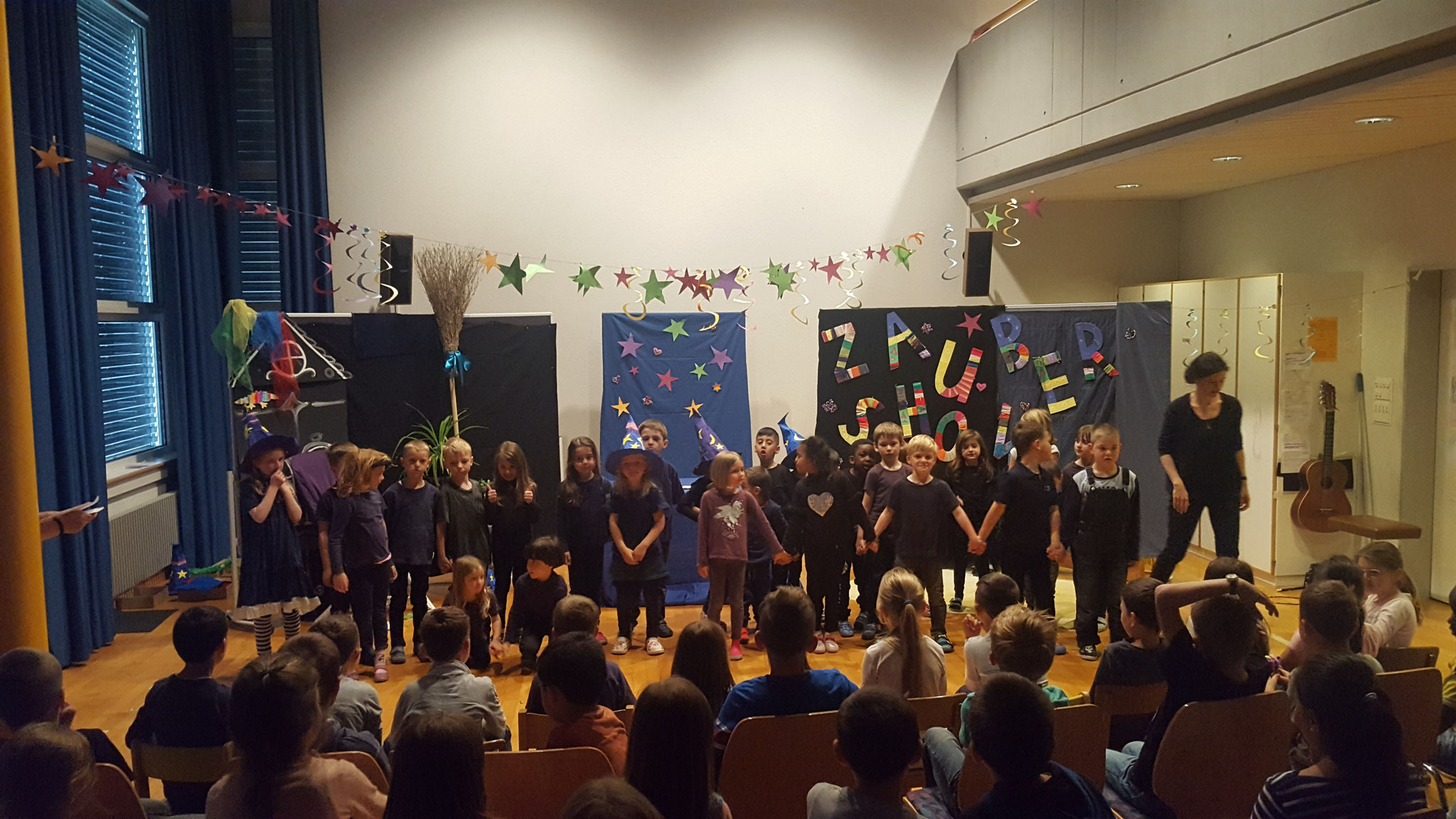 Mit Zauberhut und Zauberumhang traten die Zauberlehrlinge mit sicheren Schrittes auf die Bühne, liessen Becher und Münzen verschwinden, Farben einfangen, Packungen schweben, Zündhölzer brennen, Finger rauchen, Blumen erscheinen und vieles mehr. Zwischen den Zauberkunststücken wurde getanzt, musiziert und gesungen. Die Zuschauerinnen und Zuschauer staunten nicht schlecht. Wie kann das sein? Was ist da passiert? Wie funktioniert das? Viele Fragezeichen blieben bei den Besucherinnen und Besucher zurück. Natürlich verrieten die Zauberlinge ihre Tricks nicht.