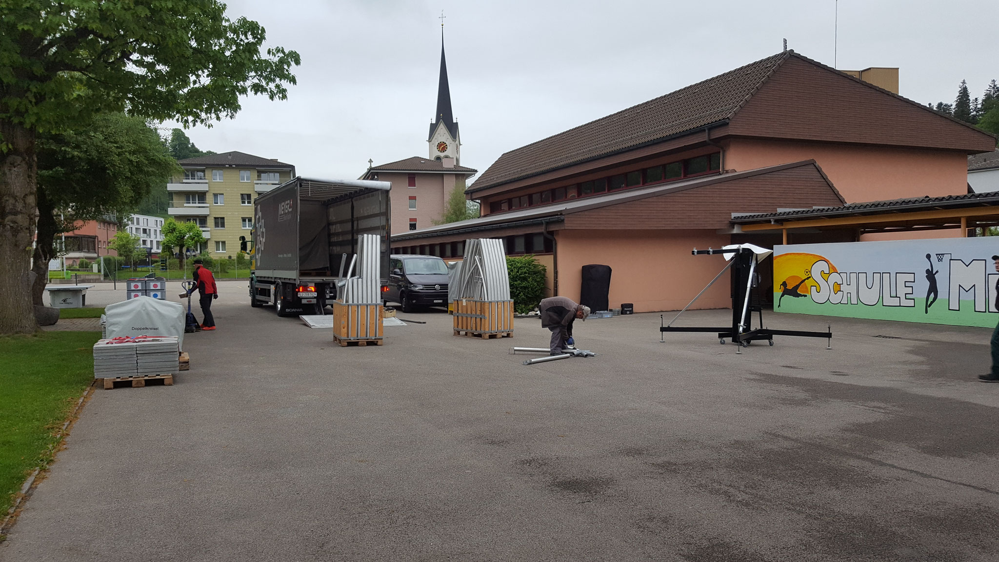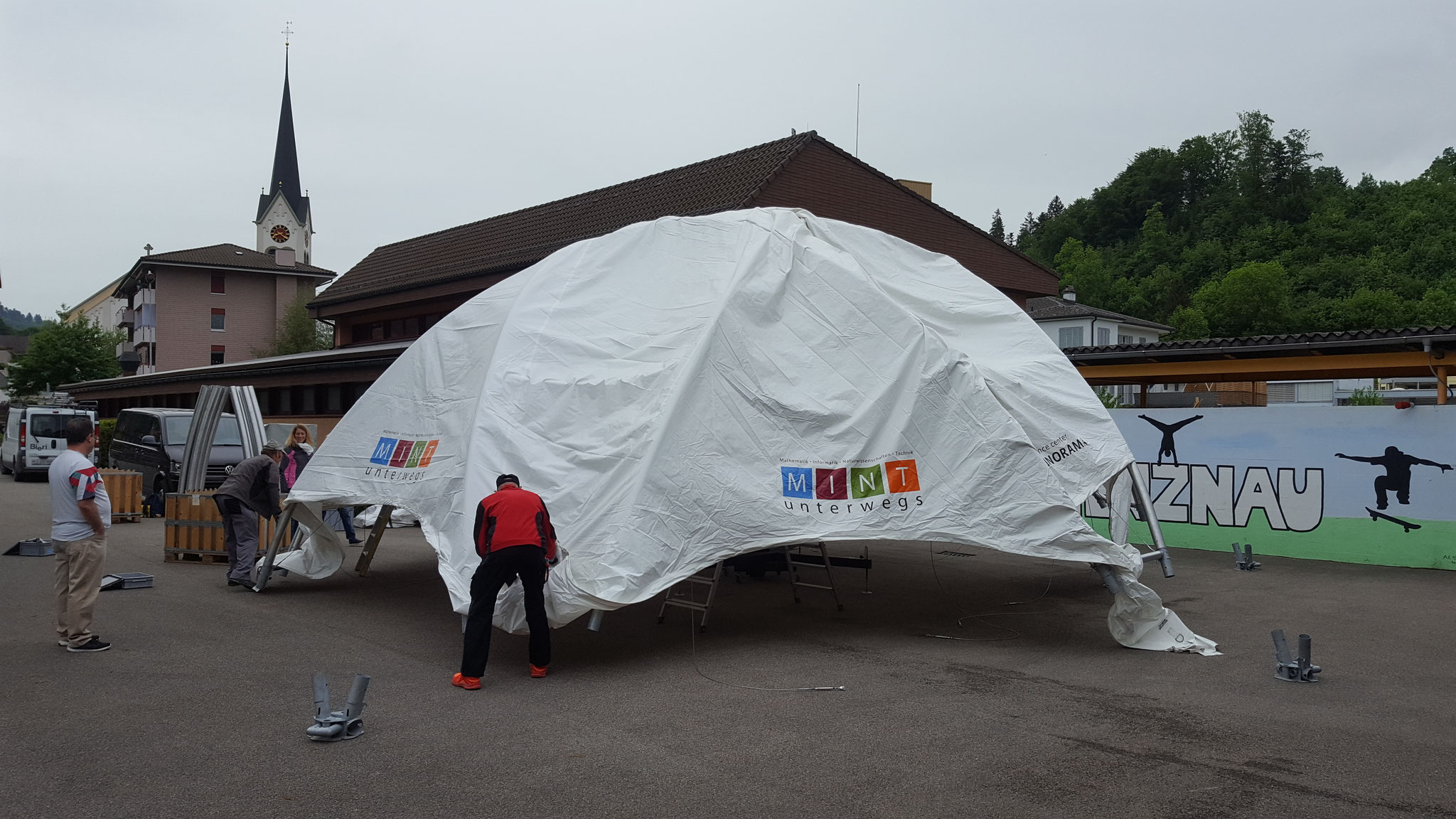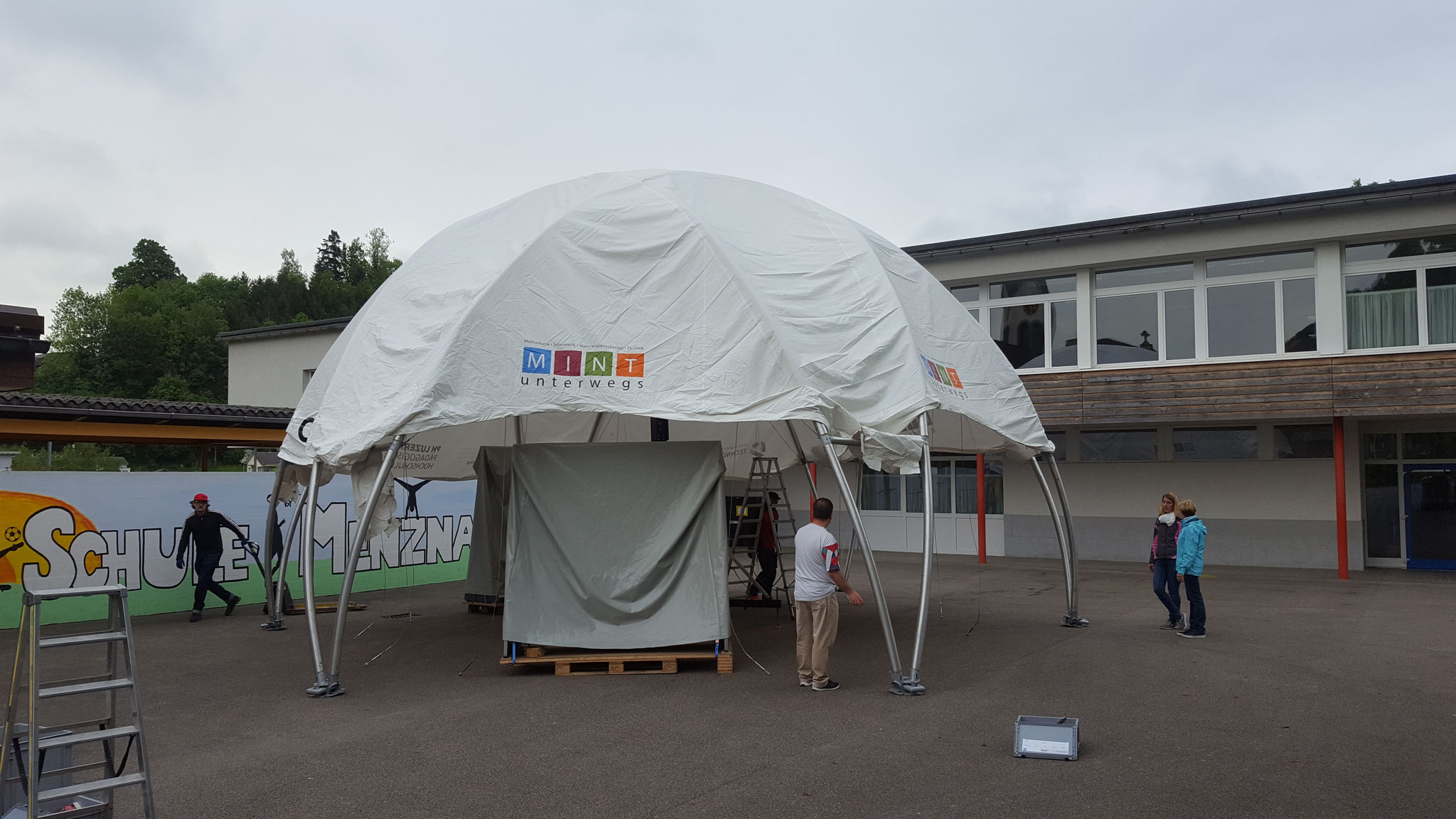Während die Schülerinnen und Schüler mit den Lehrpersonen die Einführungslektionen in die MINT-Woche starten konnten, musste auf dem Schulhausareal Menznau das MINT-Zelt aufgebaut werden. Ein Camion lieferte das Zeltmaterial und die Ausstellungsexponate früh morgens an. Michael Flury koordinierte den Aufbau den Aufbau des Zeltes. Dank der Hilfe von vier Lehrpersonen war das Zelt innert drei Stunden aufgebaut und eingerichtet.