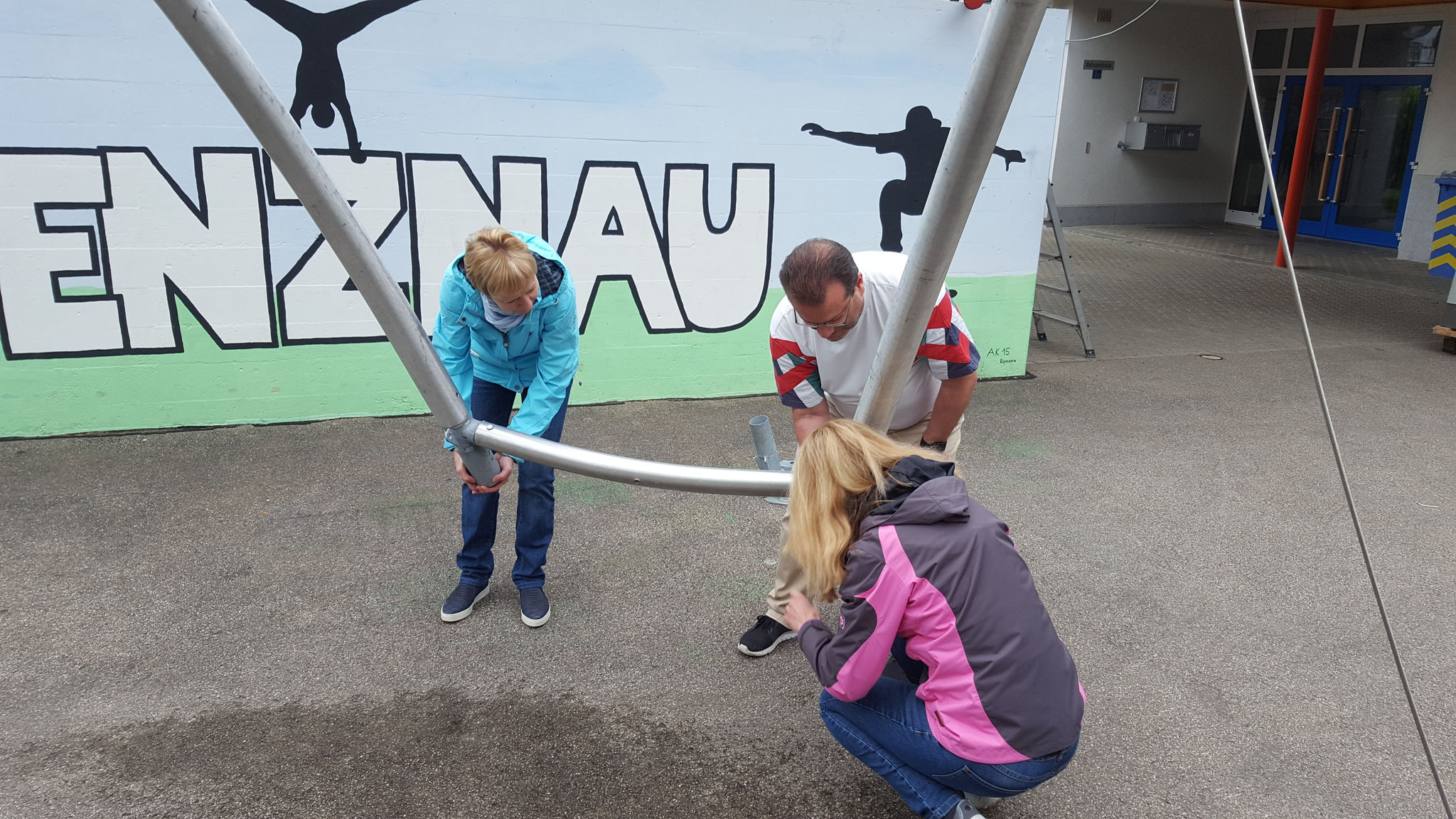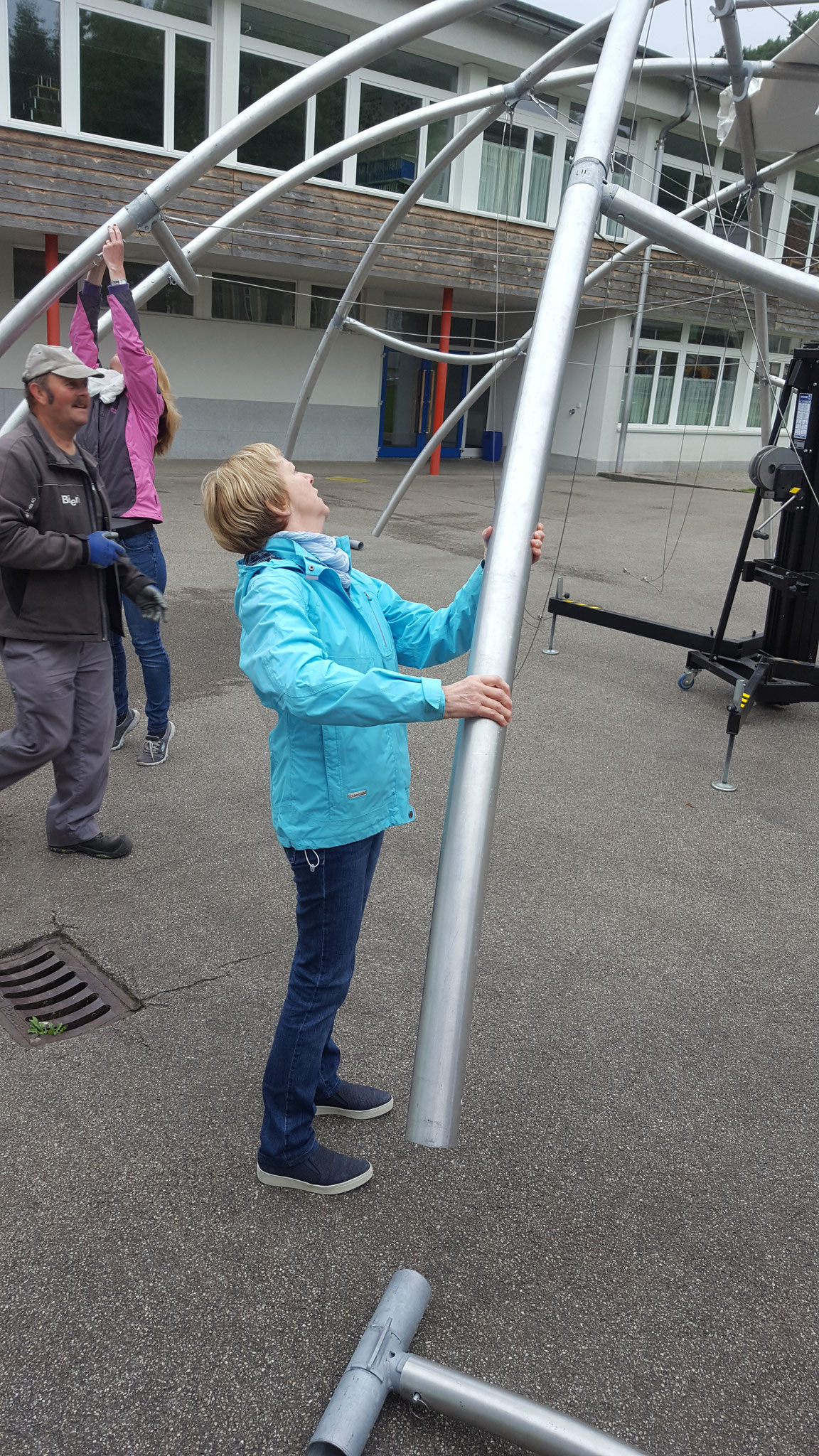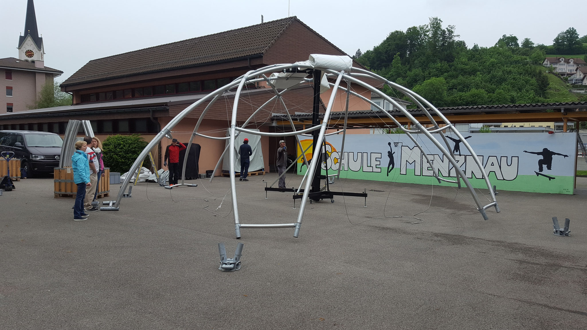 Während die Schülerinnen und Schüler mit den Lehrpersonen die Einführungslektionen in die MINT-Woche starten konnten, musste auf dem Schulhausareal Menznau das MINT-Zelt aufgebaut werden. Ein Camion lieferte das Zeltmaterial und die Ausstellungsexponate früh morgens an. Michael Flury koordinierte den Aufbau den Aufbau des Zeltes. Dank der Hilfe von vier Lehrpersonen war das Zelt innert drei Stunden aufgebaut und eingerichtet.