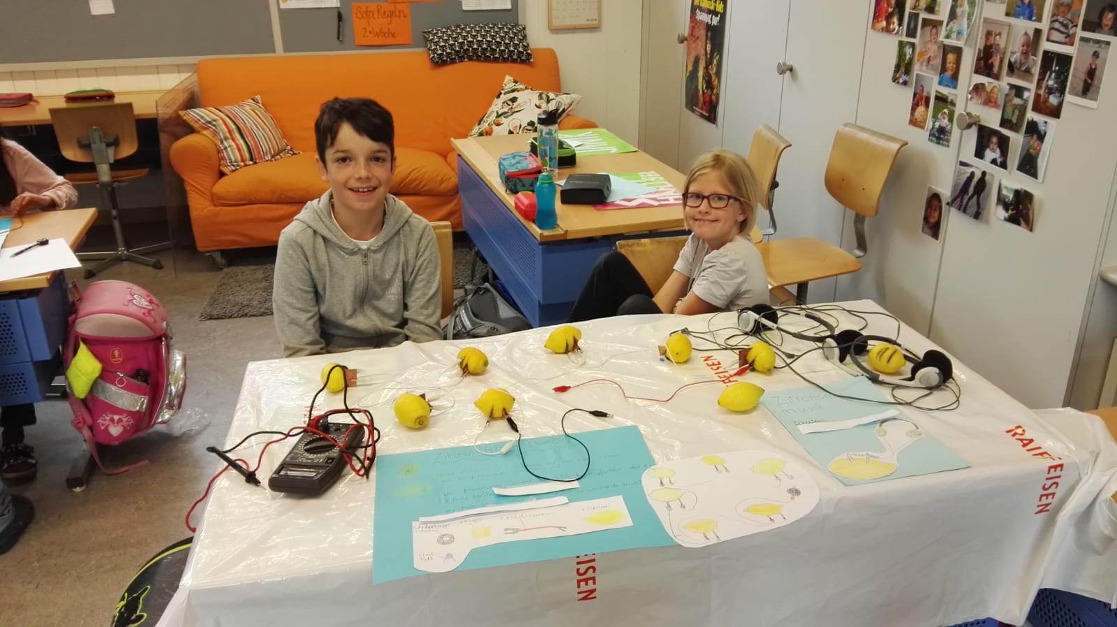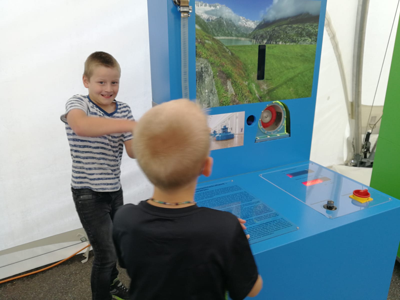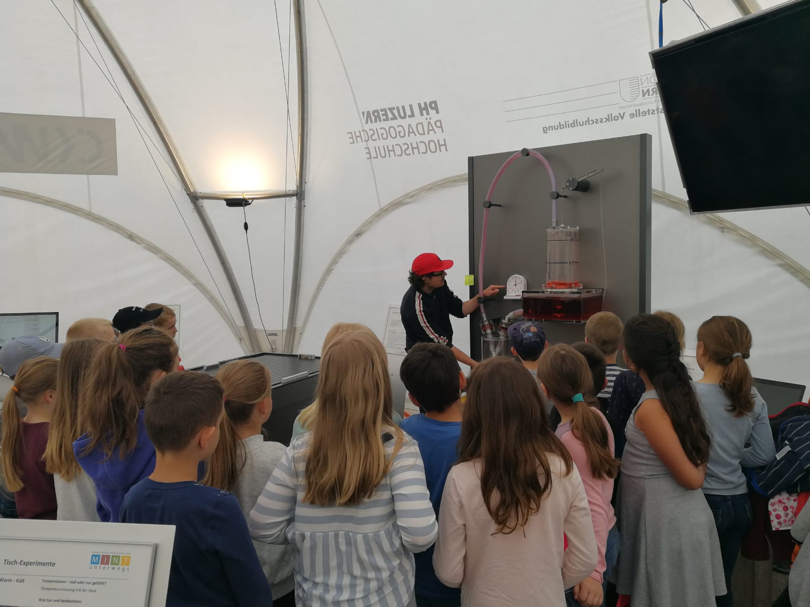 Am letzten Projekttag durften die Schülerinnen und Schüler aus Entdeckungstour gehen und schauen, welche Thematik die anderen Klassen in diesen Woche behandelten. Auch die Eltern waren zu diesem sogenannten "Marktplatz" eingeladen. Die Hälfte der Schülerinnen und Schüler betreute den Posten vor Ort, die andere Hälfte liess sich die Experimente erklären und durften selber Handanlegen. Da es im Schulhaus dadurch zu Betriebslärm kam und das Zelt in dieser Zeit nicht gebraucht wurde, durfte die 1./2. Klasse Menznau eine kleine Vorführung im Zelt geniessen.