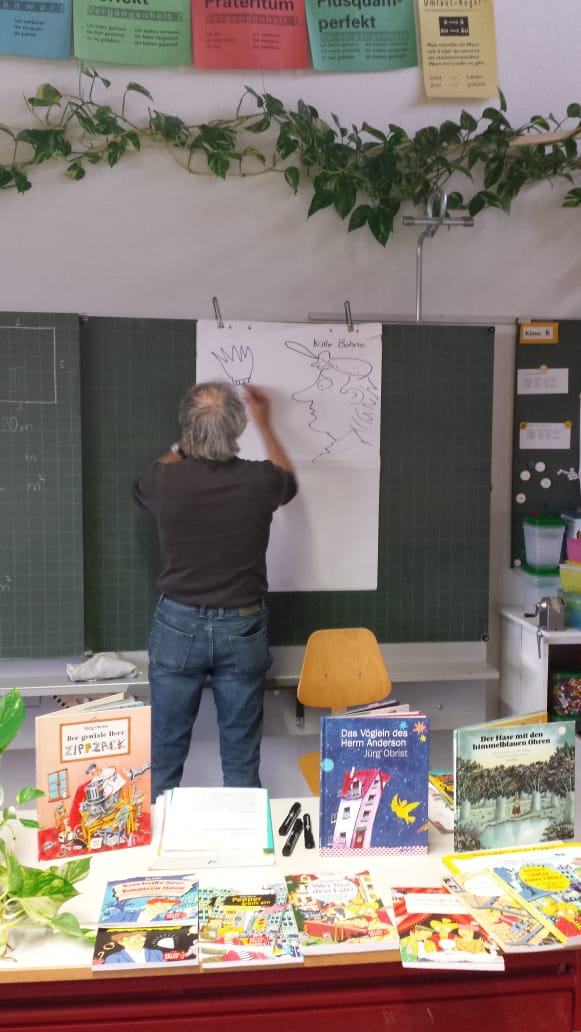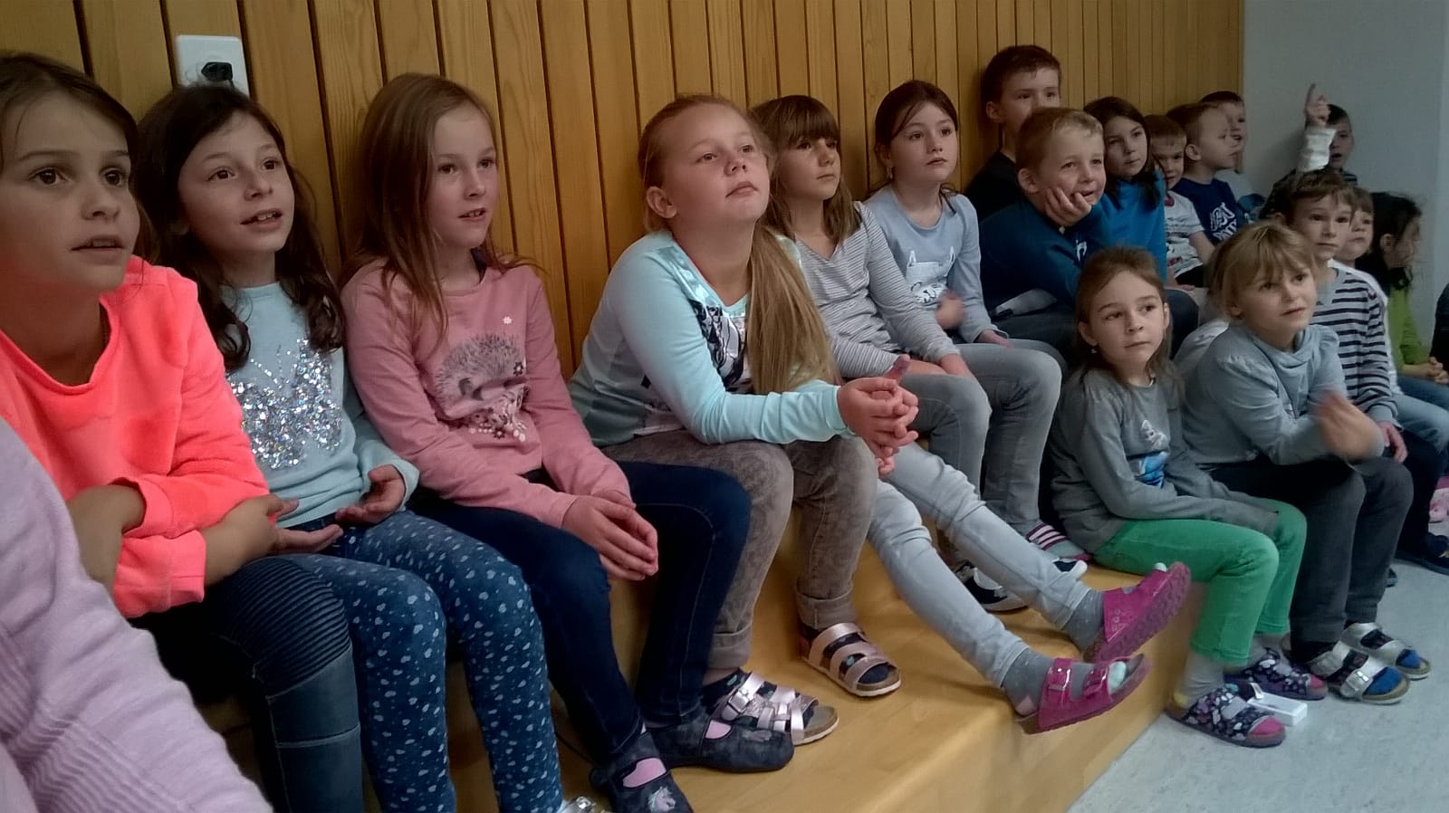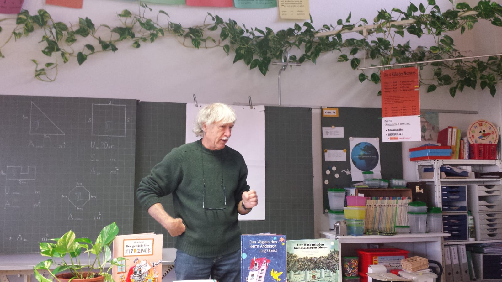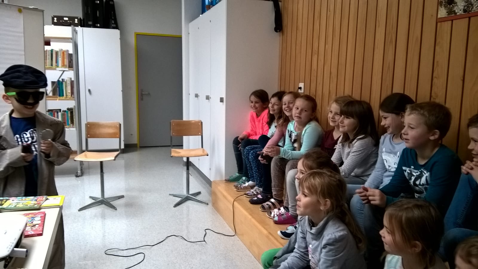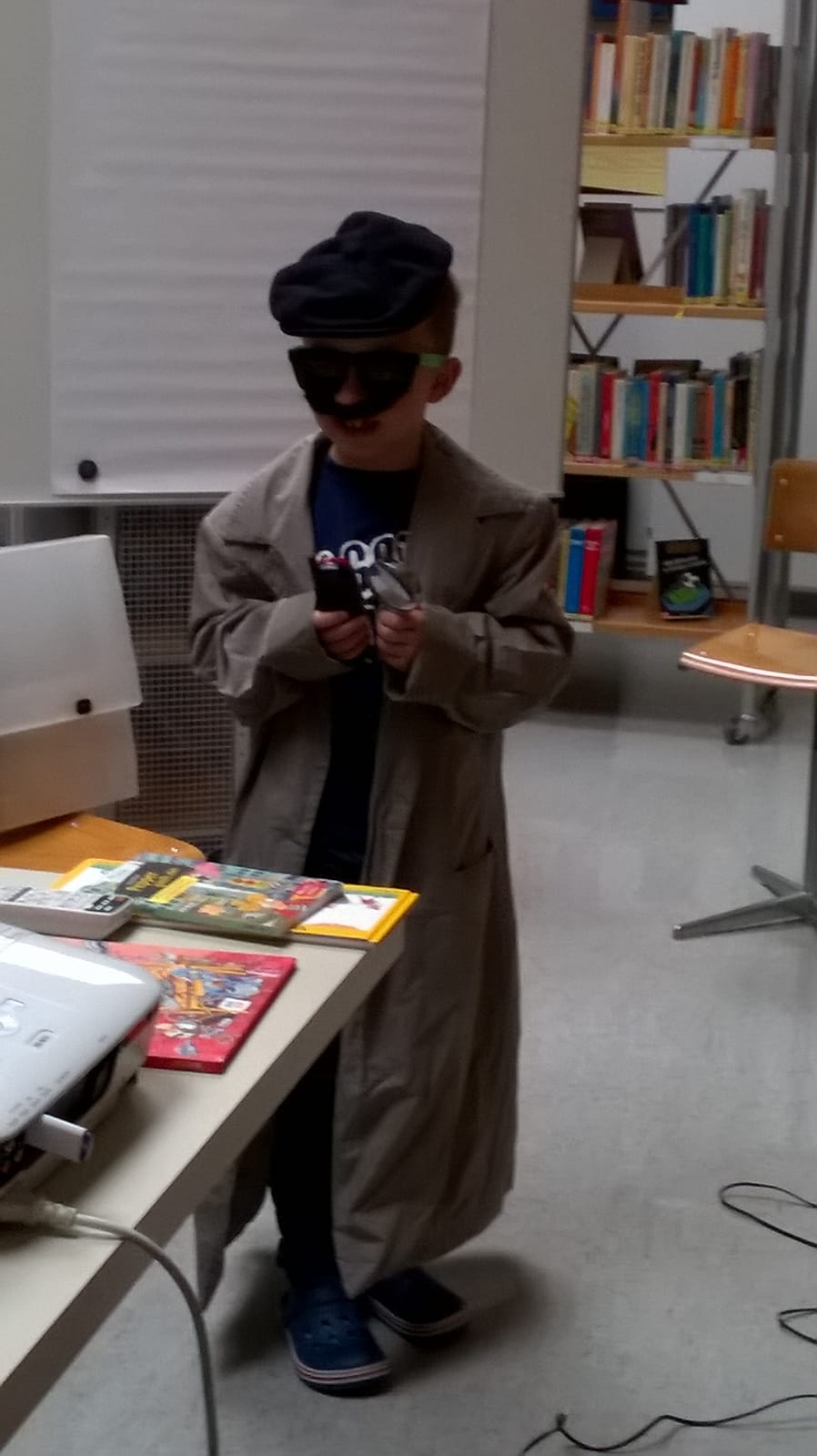 Er stellte den Schülerinnen und Schüler die beiden Kommissare, Gitta Gurke und Kalle Bohne vor. Herr Obrist verstand es die Kinder mit einzubeziehen. Sogar als Detektiv durfte sich ein Kind verkleiden. Mit Hilfe der Lernenden haben sie dann verschiedene Fälle gelöst. Da war ein gutes Zuhören und Hinschauen gefragt.