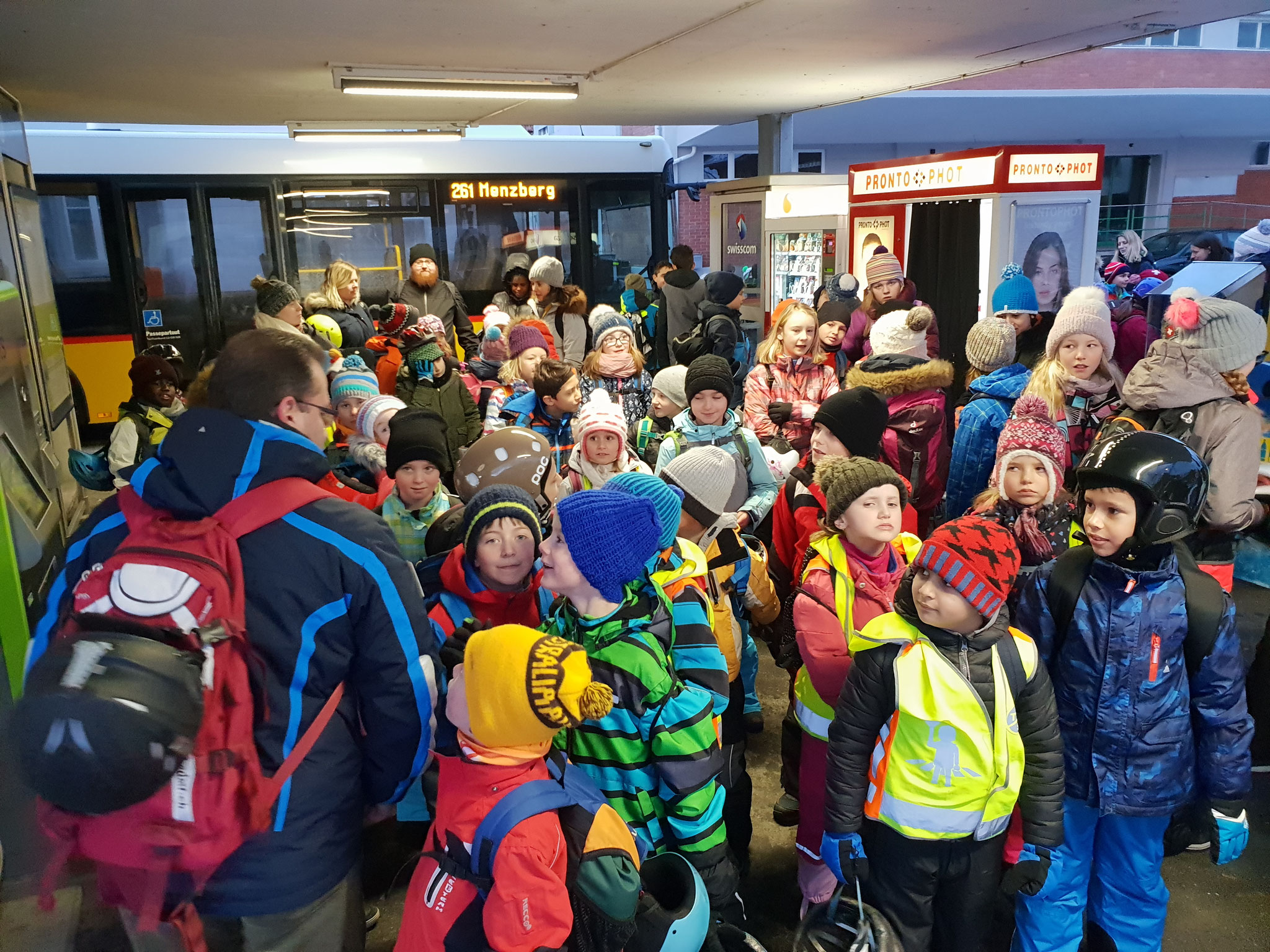 Auch die Menznauer wagten sich in diesem Winter auf das Eis. Neu durften die Kinder der 1./2. Klasse mit auf den Wintersporttag. Bisher war dies nur den Kindern ab der 3. Klasse vorbehalten. Mit 122 Kindern und 13 Begleitpersonen war der Zug nach Luzern schon relativ voll. Die Zweierkolonne aller Klassen erstreckte sich über mehr als 200 Meter bis zum Eiszentrum in Luzern. Innerhalb von 15 Minuten waren die grosse Schar mit Schlittschuhen ausgerüstet.