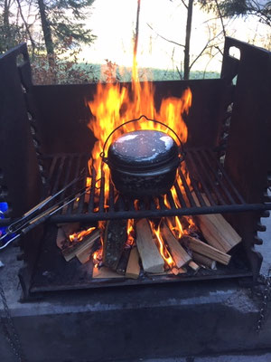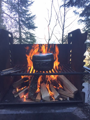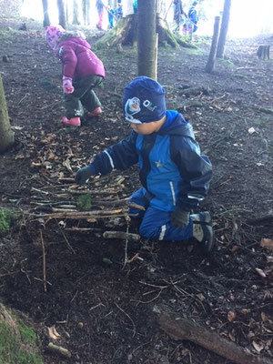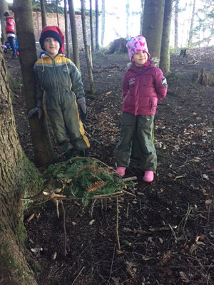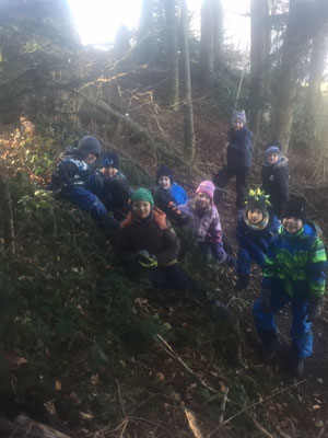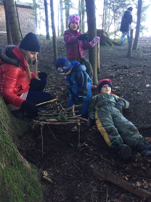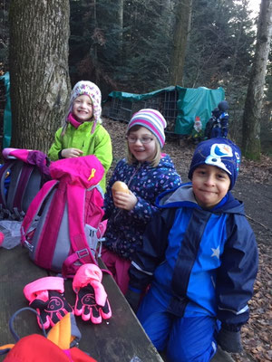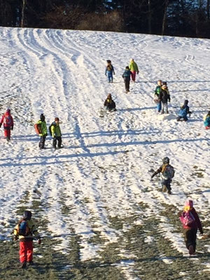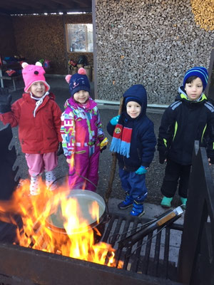 Jedes Mal, wenn die Kinder Richtung „Gassmeshuuswald“ marschieren, gibt es neues zu entdecken und zu bestaunen. Dieses Mal ist es einsitzender „Fasnachtsgöiggel“. Lustig waren die Rutsch- und Rollexperimente im Schnee. Am Feuer konnten sich die Kindergartenkinder aufwärmen. Schwimmende Backerbsen in einer selbst gemachten Bouillonsuppe liessen die Kinderherzen höher schlagen. Der Hunger war genügend gross, um danach noch Würste zu bräteln. Die Kinder bauten Zwergenhäuser, rollten den Hang hinunter und entdeckten ein schönes Herz, welches aus einer gefällten Tanne entstanden war. Der Wald bietet uns immer wieder die Möglichkeit, intensive Körperbewegungen, grosse Naturerfahrungen und Kreativität im Freien und im Kindergartenalltag zu integrieren. Die Stimmung und der Zusammenhalt waren wieder sehr gut.