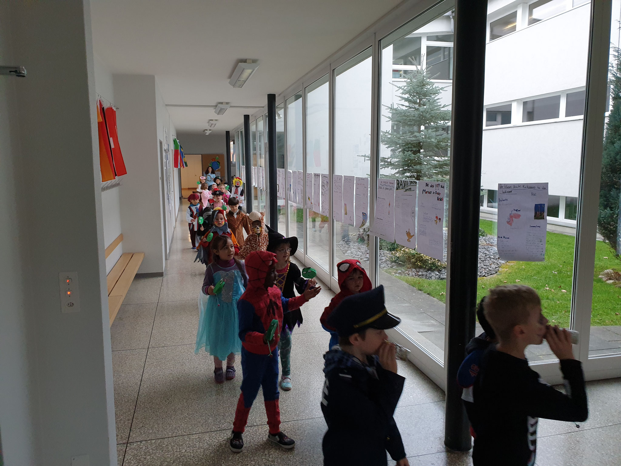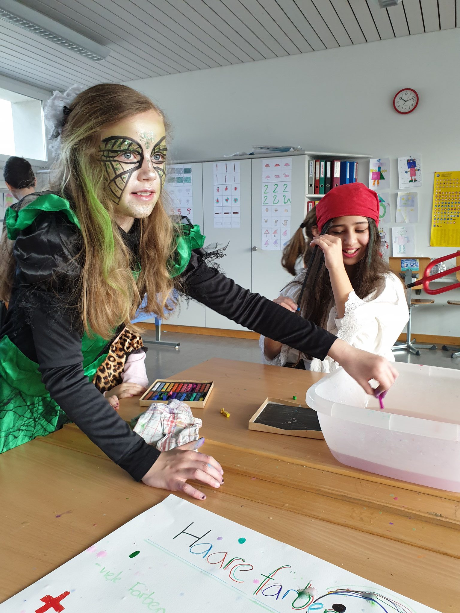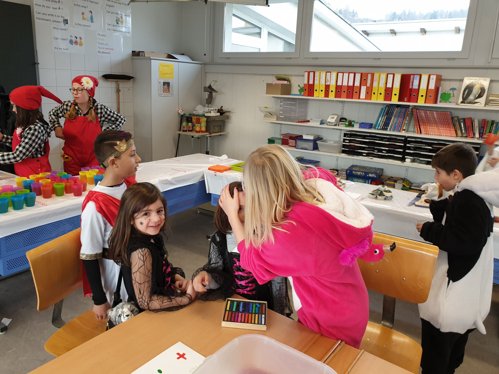 Jede Klasse bereitete an der Schulfasnacht ein Atelier vor. In der Spielhölle konnten sich die Kinder Bons für Kuchen und Getränke ergattern. Beim Kuchenessen liessen sich einige die Haare färben oder sich voll zu stempeln. Fröhlich und gespannt gelangten die Kinder in die gruselige Geisterbahn und kamen kreideweiss wieder heraus. Lag es an der Musik, der Dunkelheit oder doch an den unerwarteten Gestalten im Raum? Das Tanzbein konnte in der Disco geschwungen werden. Die längste Girlande gestalteten die Kinder in der Bastelecke. Zudem konnten die Fasnächtler einen Parcours absolvieren oder sich noch schminken lassen.