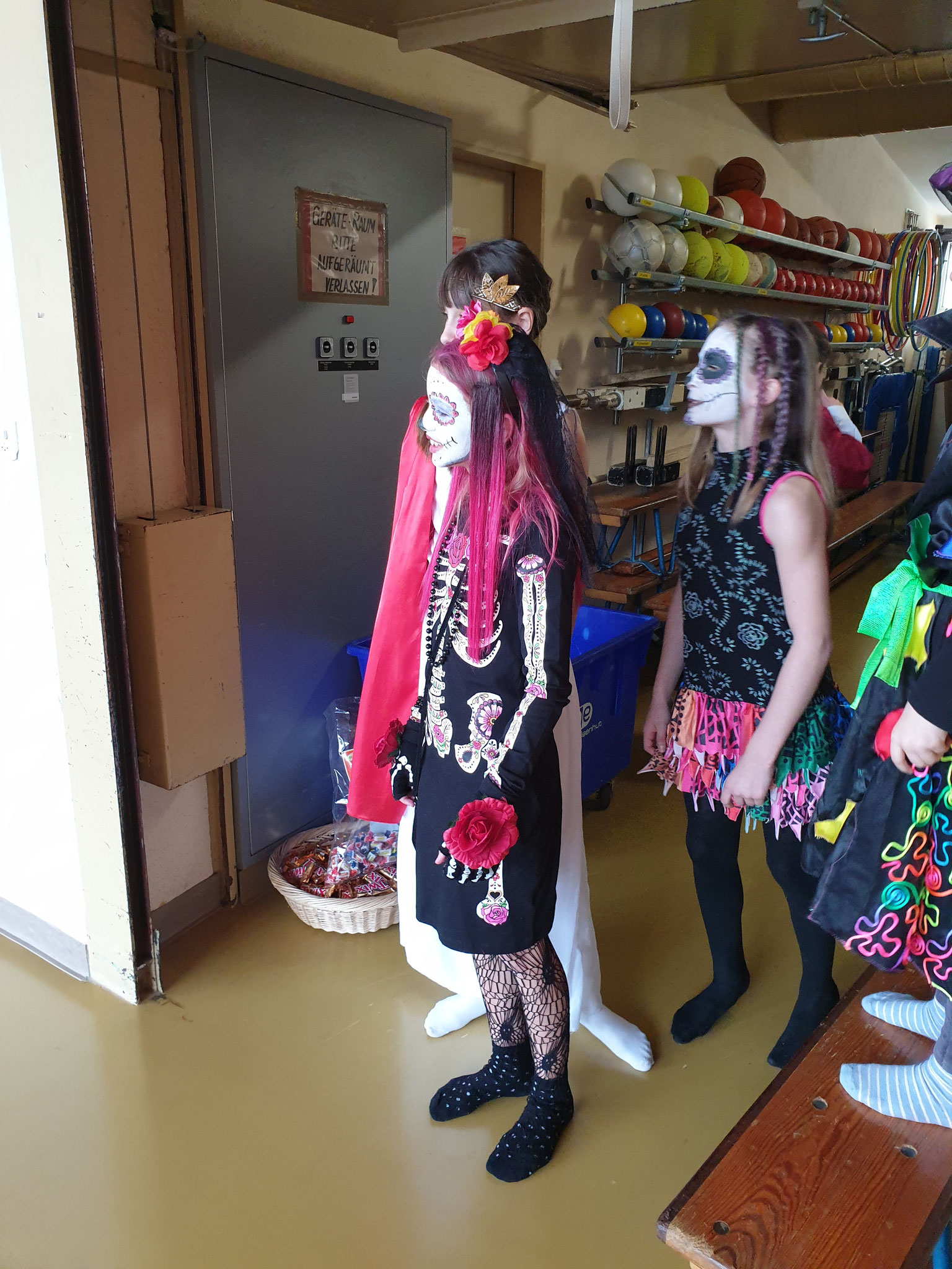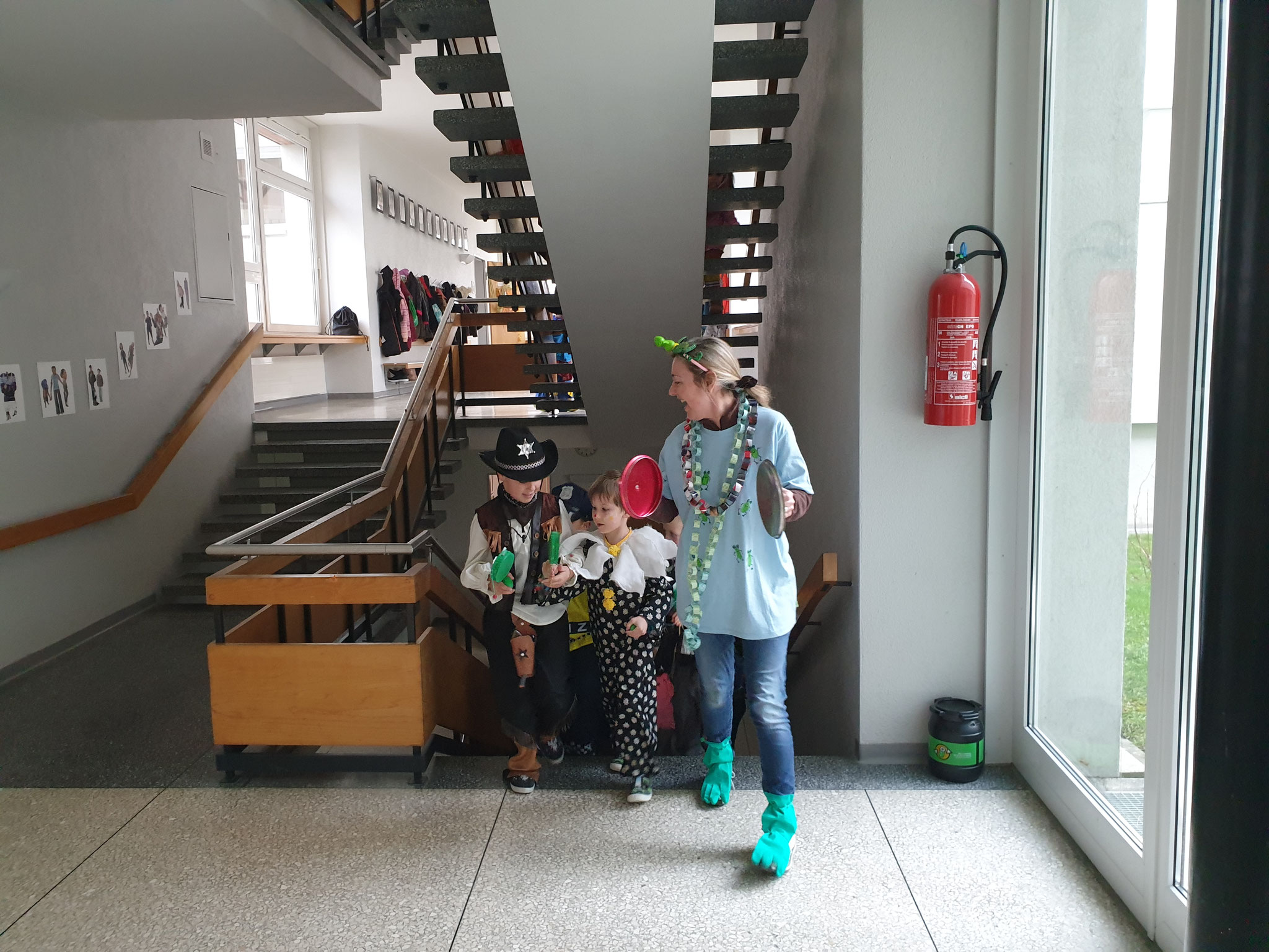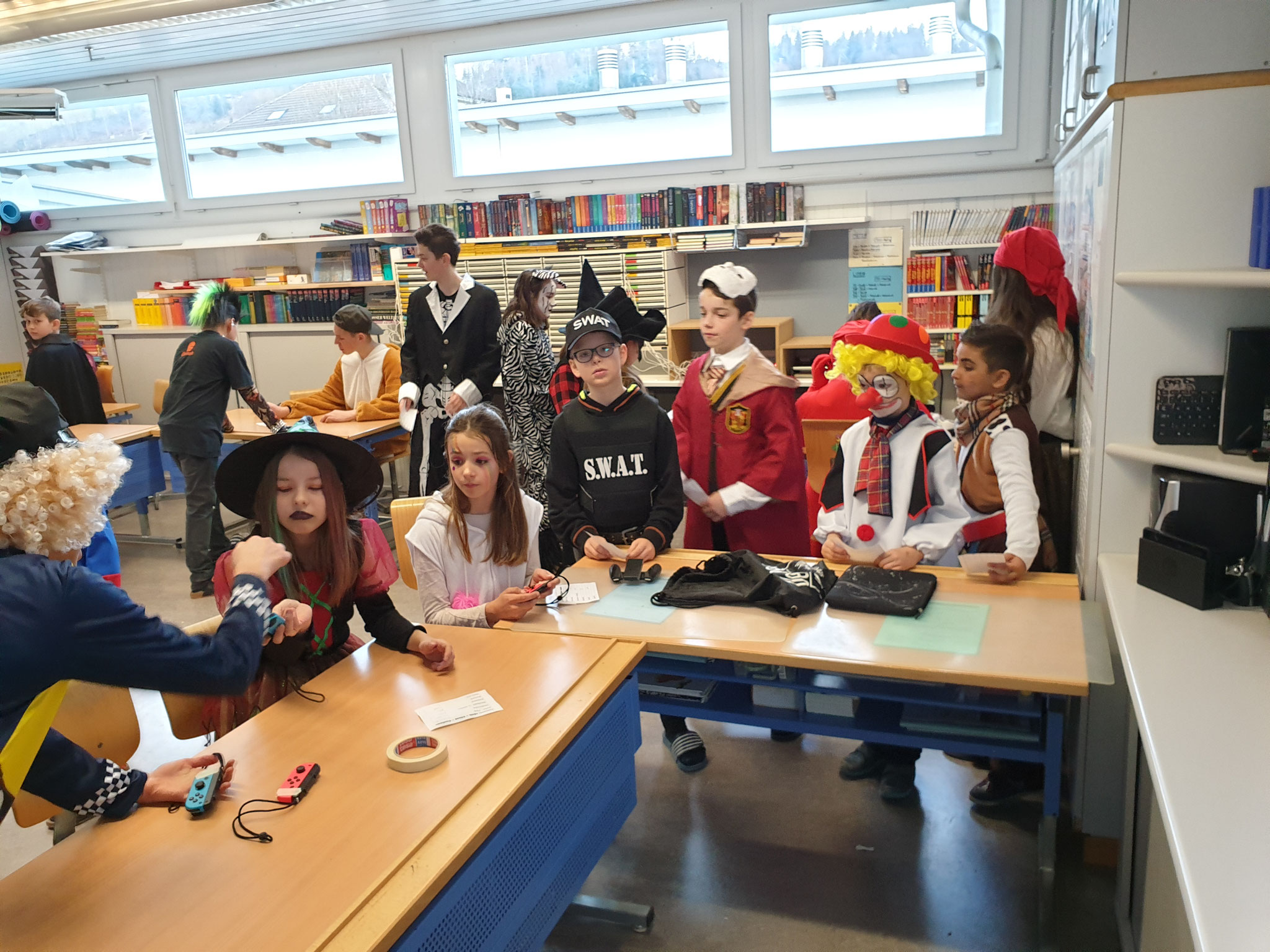 Jede Klasse bereitete an der Schulfasnacht ein Atelier vor. In der Spielhölle konnten sich die Kinder Bons für Kuchen und Getränke ergattern. Beim Kuchenessen liessen sich einige die Haare färben oder sich voll zu stempeln. Fröhlich und gespannt gelangten die Kinder in die gruselige Geisterbahn und kamen kreideweiss wieder heraus. Lag es an der Musik, der Dunkelheit oder doch an den unerwarteten Gestalten im Raum? Das Tanzbein konnte in der Disco geschwungen werden. Die längste Girlande gestalteten die Kinder in der Bastelecke. Zudem konnten die Fasnächtler einen Parcours absolvieren oder sich noch schminken lassen.