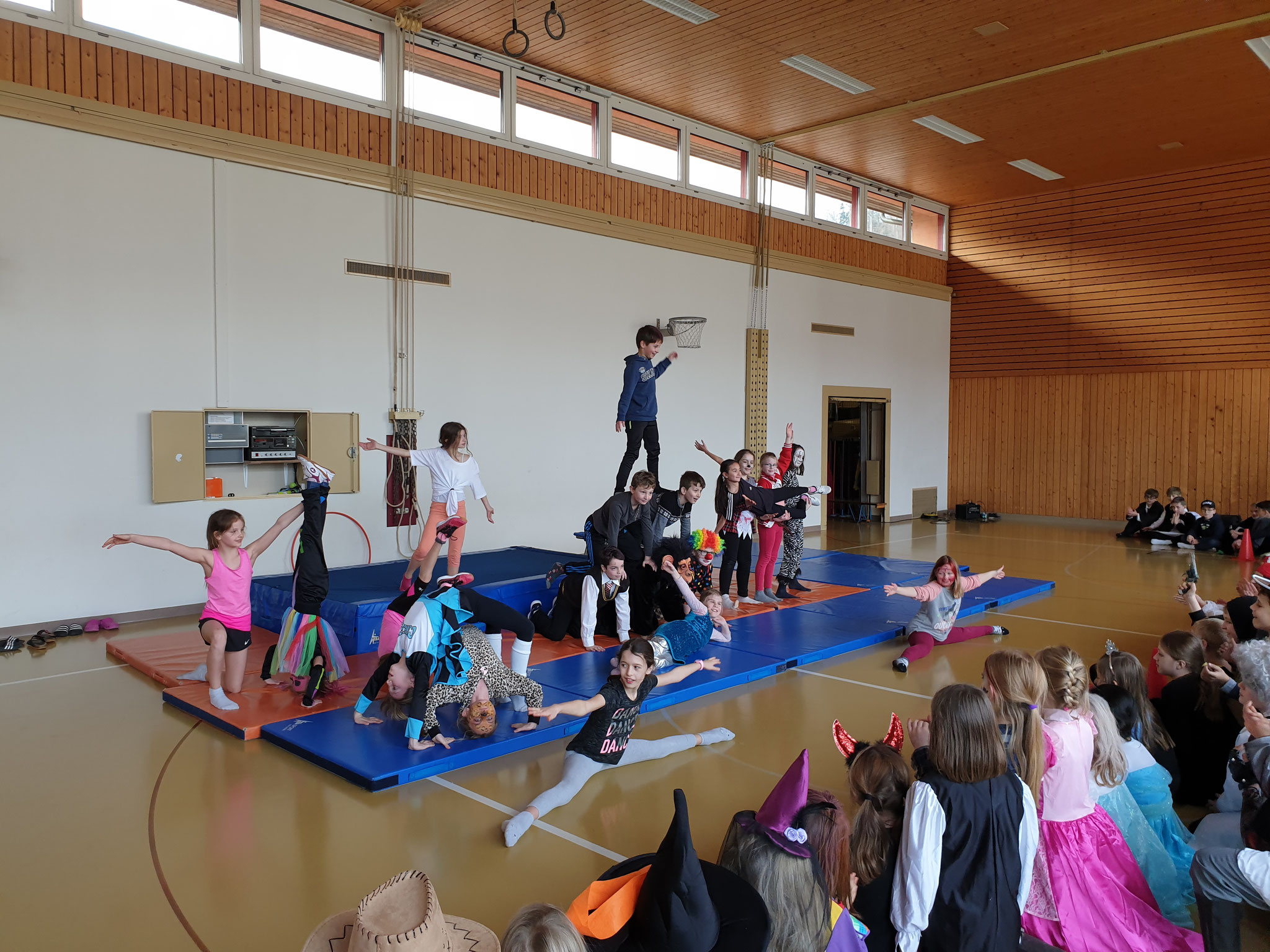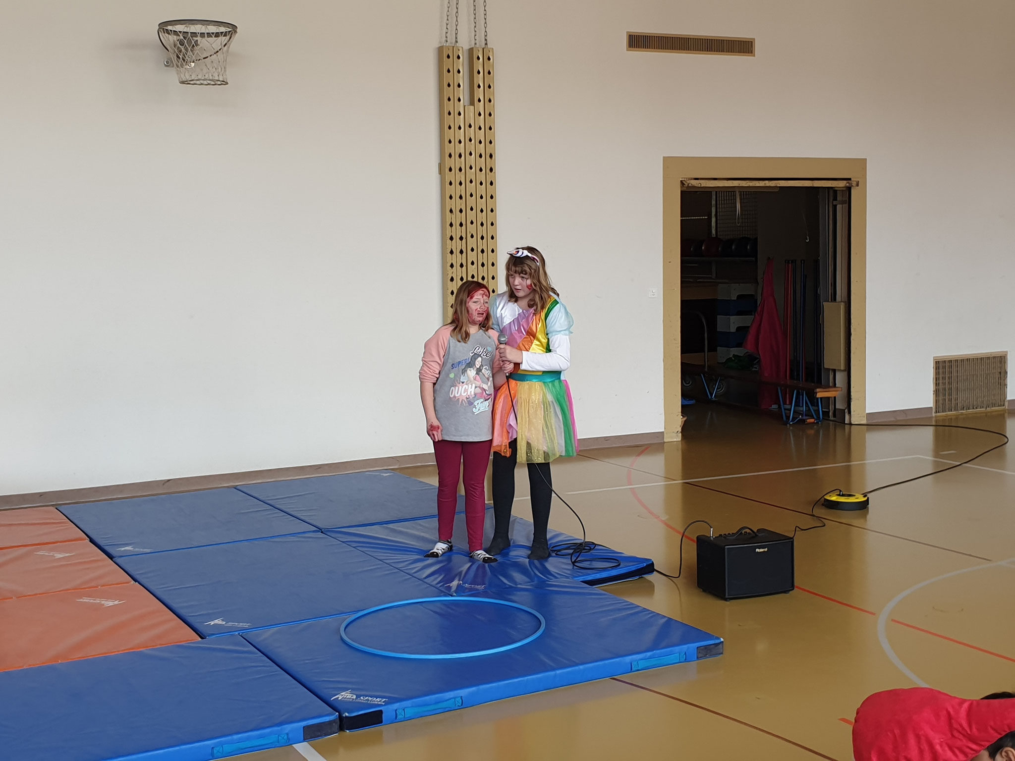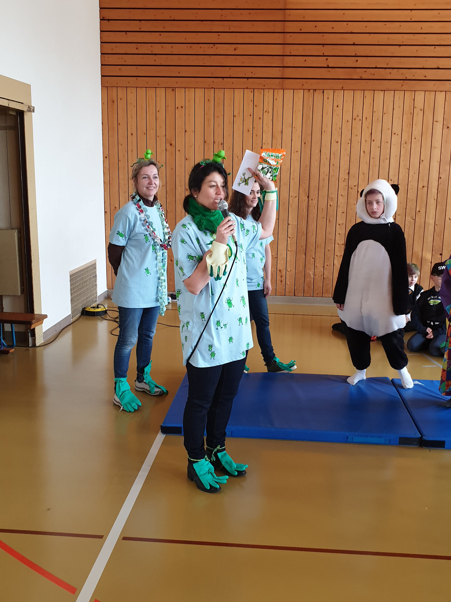 Nach dem Mittagessen mit Brot und Buchstabensuppe ging es in der Turnhalle weiter. Klassen und Gruppen konnten im Vorfeld eine Eingabe machen und danach der ganzen Schule vorzeigen. So gab es ein Gitarrenquartett, ein Singduo, eine jüngere und eine ätere Tanzgruppe, einen Fasnachtsvers und eine Turnshow. Auch ein Froschwettbewerb wurde durchgeführt. Zuletzt liefen noch die besten Kostümierungen über den Laufsteg.
