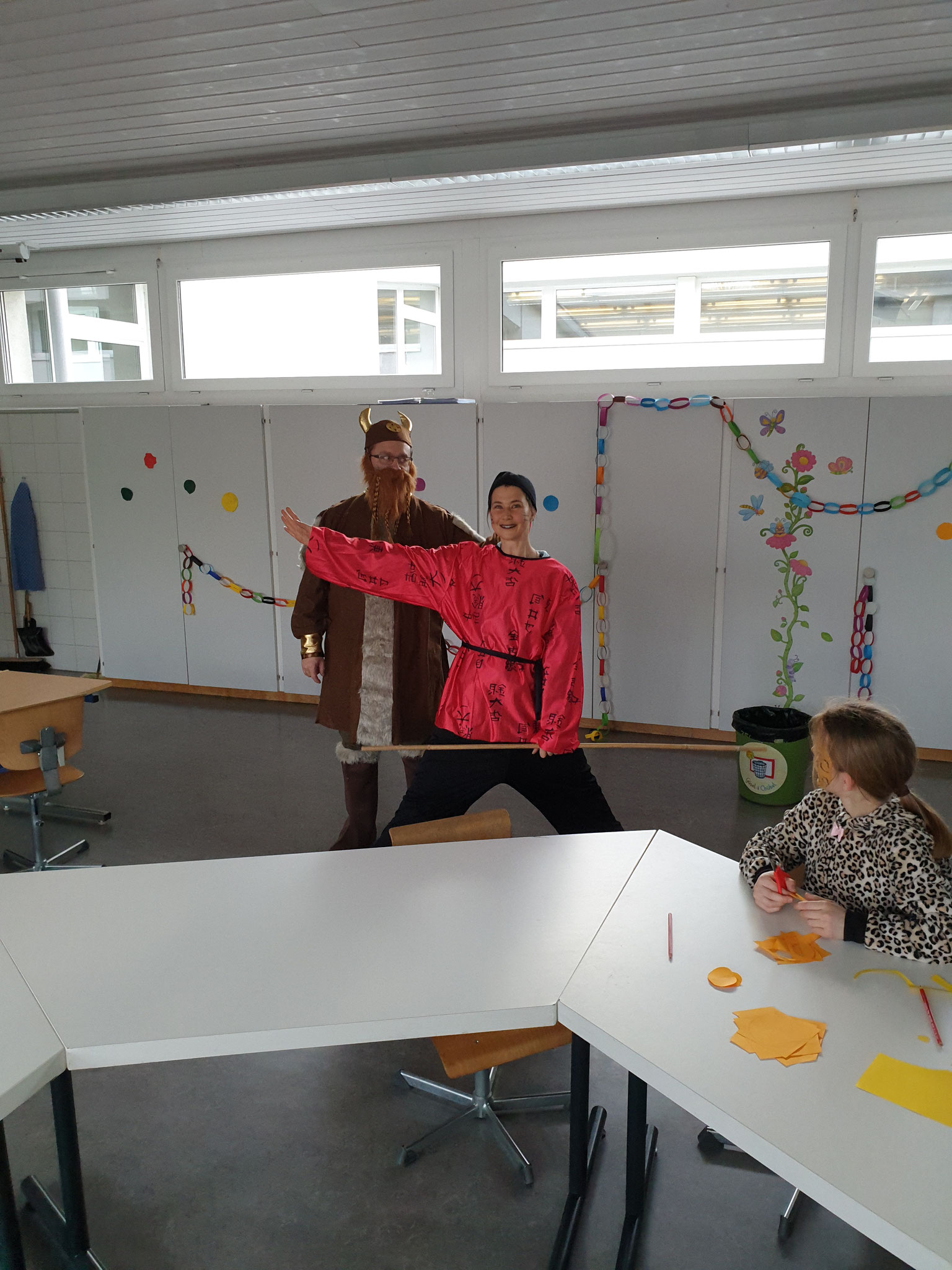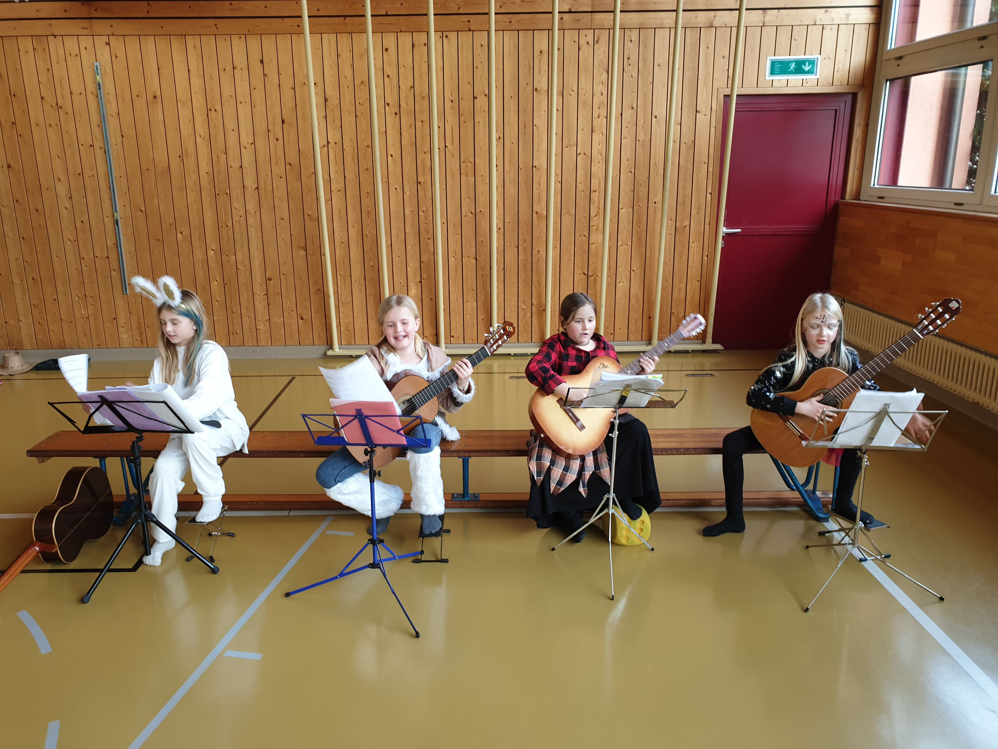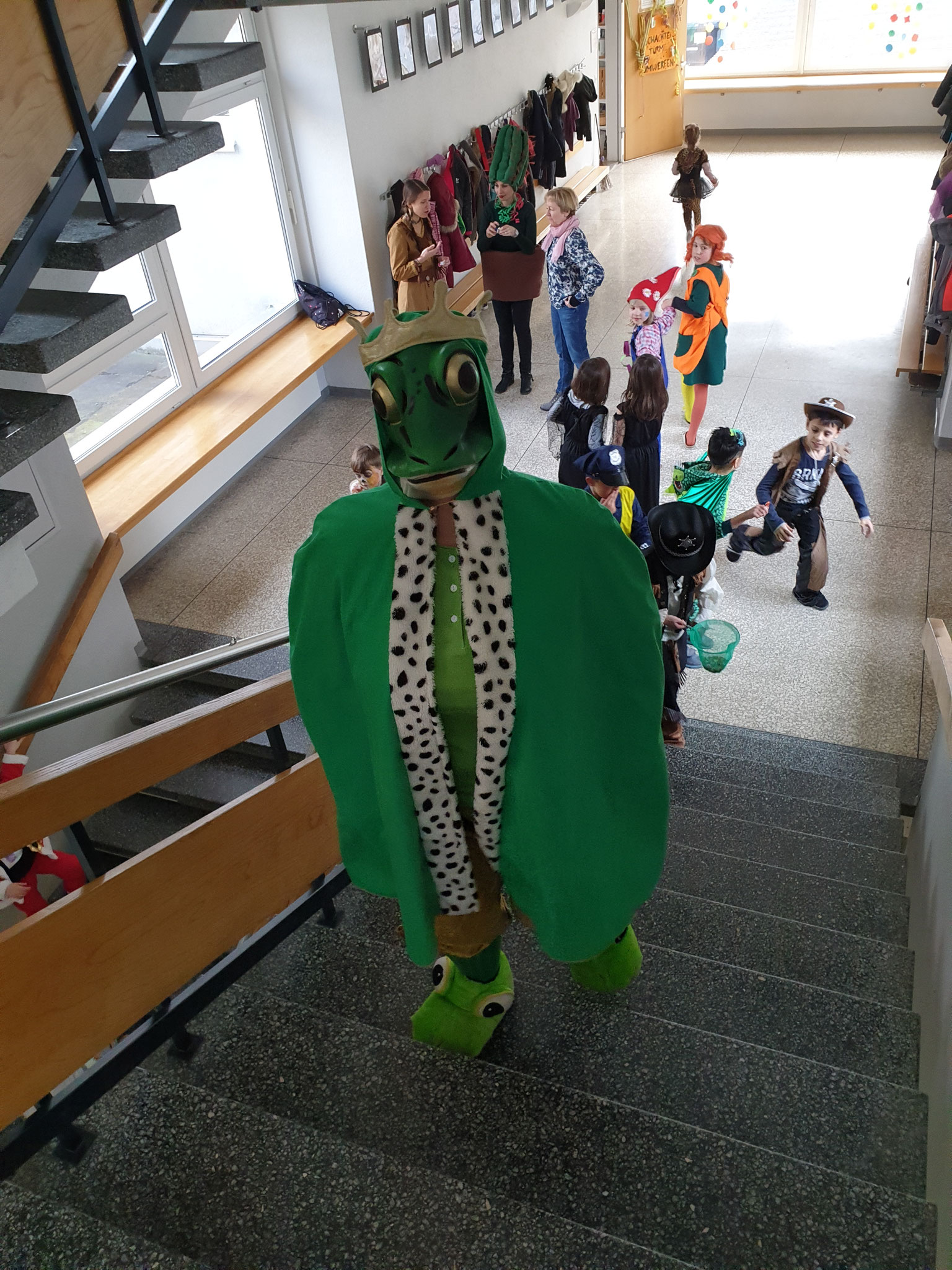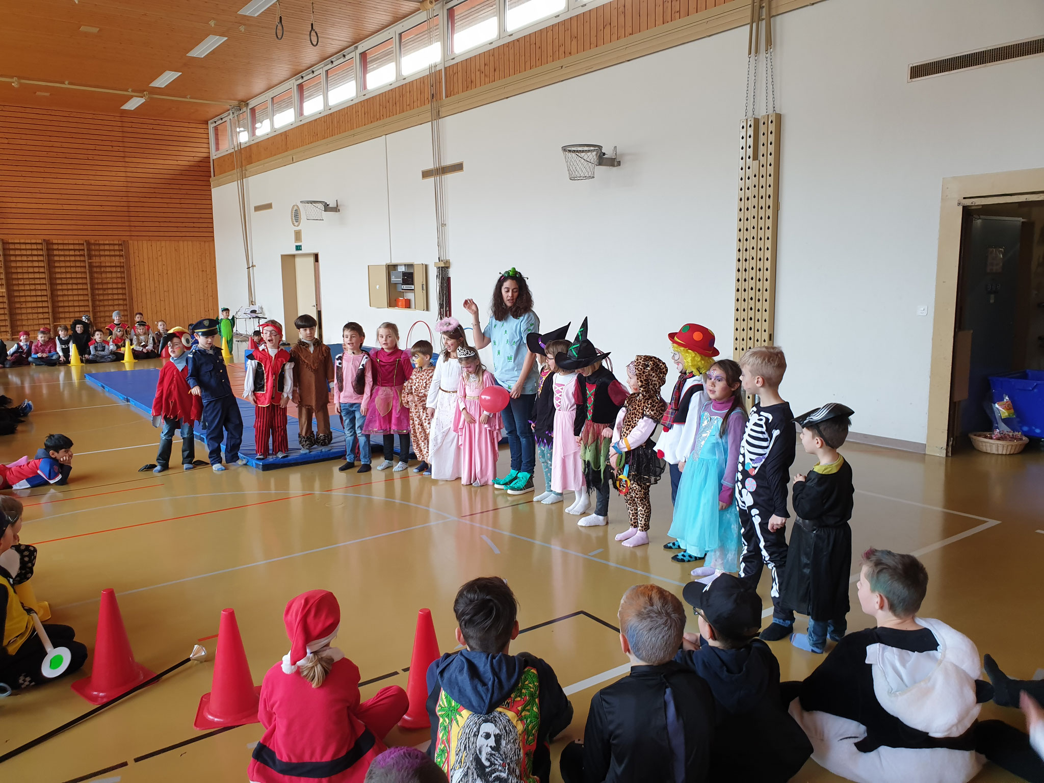 Nach dem Mittagessen mit Brot und Buchstabensuppe ging es in der Turnhalle weiter. Klassen und Gruppen konnten im Vorfeld eine Eingabe machen und danach der ganzen Schule vorzeigen. So gab es ein Gitarrenquartett, ein Singduo, eine jüngere und eine ätere Tanzgruppe, einen Fasnachtsvers und eine Turnshow. Auch ein Froschwettbewerb wurde durchgeführt. Zuletzt liefen noch die besten Kostümierungen über den Laufsteg.