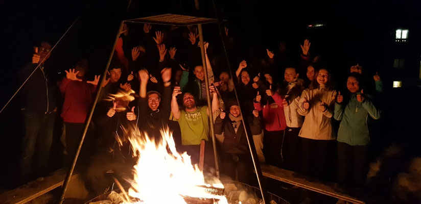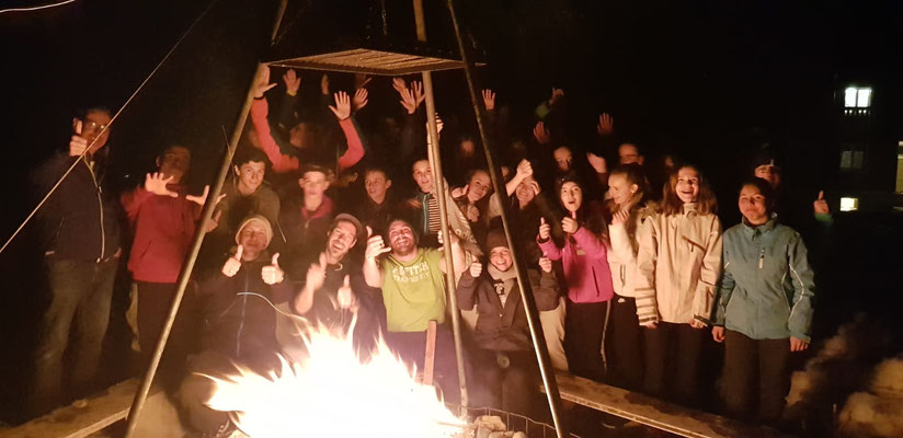 Nach einem leckeren 3-Gang-Menü hatten die noch immer muntere Truppe Zeit, erste Packversuche zu tätigen und einfach ein bisschen zu "hängen", was ja allseits bekannt und beliebt ist bei den Jugendlichen. Um 21.00 Uhr besammelten sich alle ums Lagerfeuer, sangen ausgelassen Lieder und genossen den gemeinsamen Abschluss mit einem leckeren Nachtisch und warmem Punsch. Schliesslich kehrte schneller Ruhe ein als erwartet! :-) Ja, das Lagerleben forderte seinen Tribut bei den Schülerinnen und Schüler, denn sie wären wohl nur allzu gern etwas länger wach geblieben. Dem Leiterteam war es mehr als nur recht, managte man doch ab dem Donnerstagmorgen auch die Küche gemeinsam.
