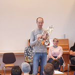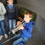 Im zweiten Teil durften die Kinder die verschiedenen Instrumente selber ausprobieren. Auf Anhieb erklangen viele schrille und harmonischere Töne. Die Musikschullehrpersonen unterstützen die Kinder mit Freude bei der Haltung und bei der Technik.
