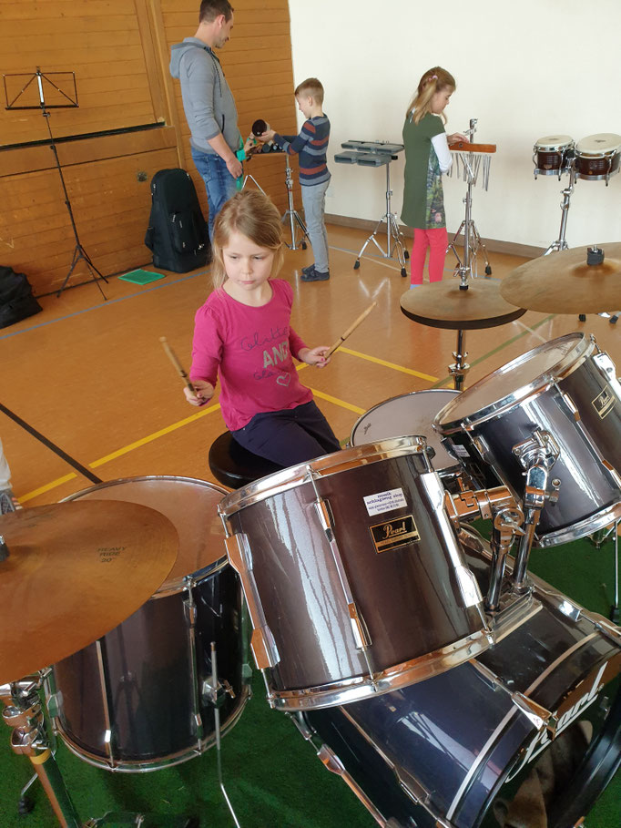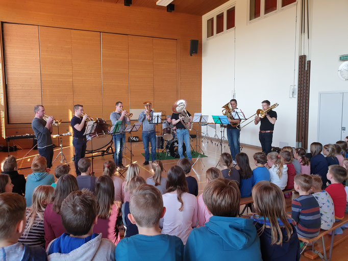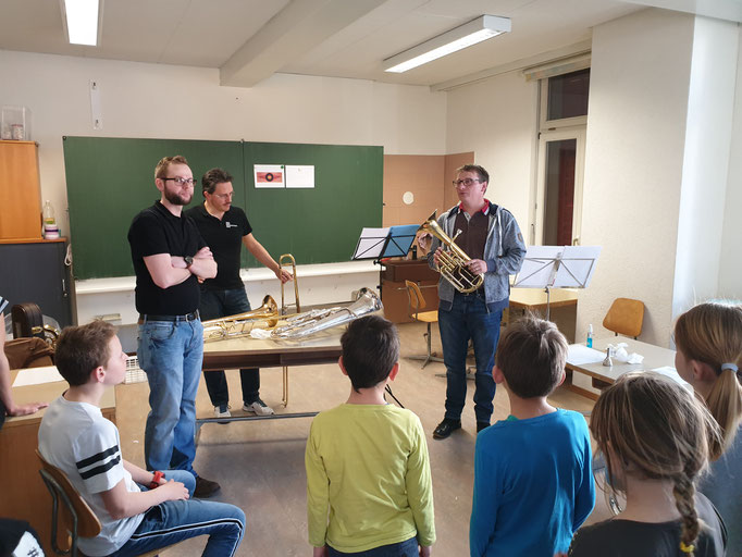 Mit dem ersten Lied holte die Brass Band die Aufmerksamkeit der Schülerinnen und Schüler ab. Danach ging es gruppenweise in verschiedene Schulzimmer bei denen die Schlaginstrumente, die grossen und die kleinen Blechblasinstrumente und die Musikgesellschaft vertieft vorgestellt wurde. Die Kinder durften danach die Instrumente selber ausprobieren. Die Mitglieder der Brass Band standen mit Rat und Tat zur Seite.