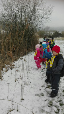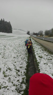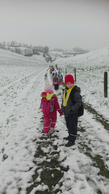 … und wir vom Kindergarten 1 Menznau wandern zu den Fröschen. Wir gumpen, hüpfen, springen lachend und singend gemeinsam durch den Schnee und die Regenpfützen zum Tuetensee.