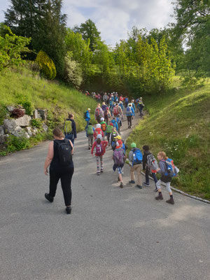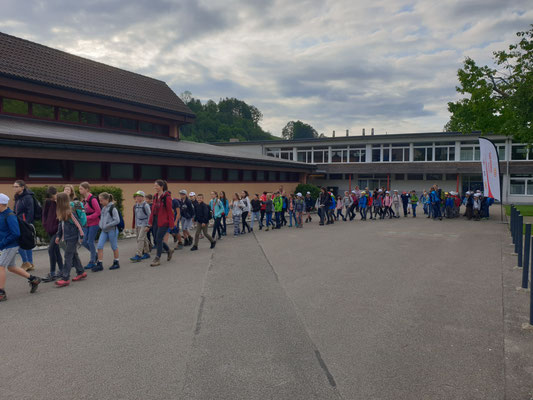 Die 1.-6. Klasse konnte ihre Frühlingswanderung bei schönem Wetter durchführen. Die Strecke führte quer durch die Gemeinde. Miteinander liefen die Klassen über die Allmend zur Jägerhütte in Geiss, wo es den ersten Halt gab. Verteilt wurde Eistee und Riegel.