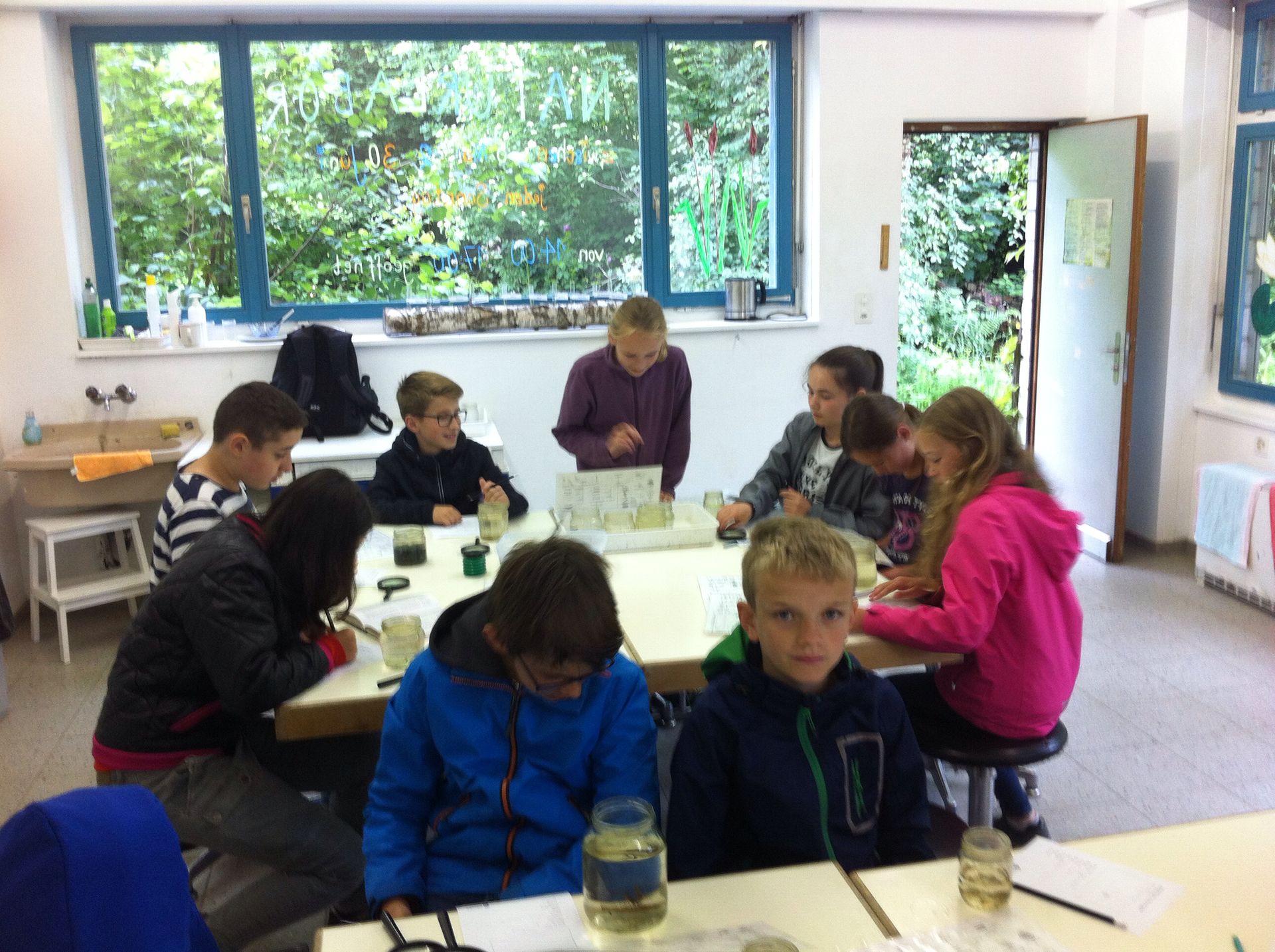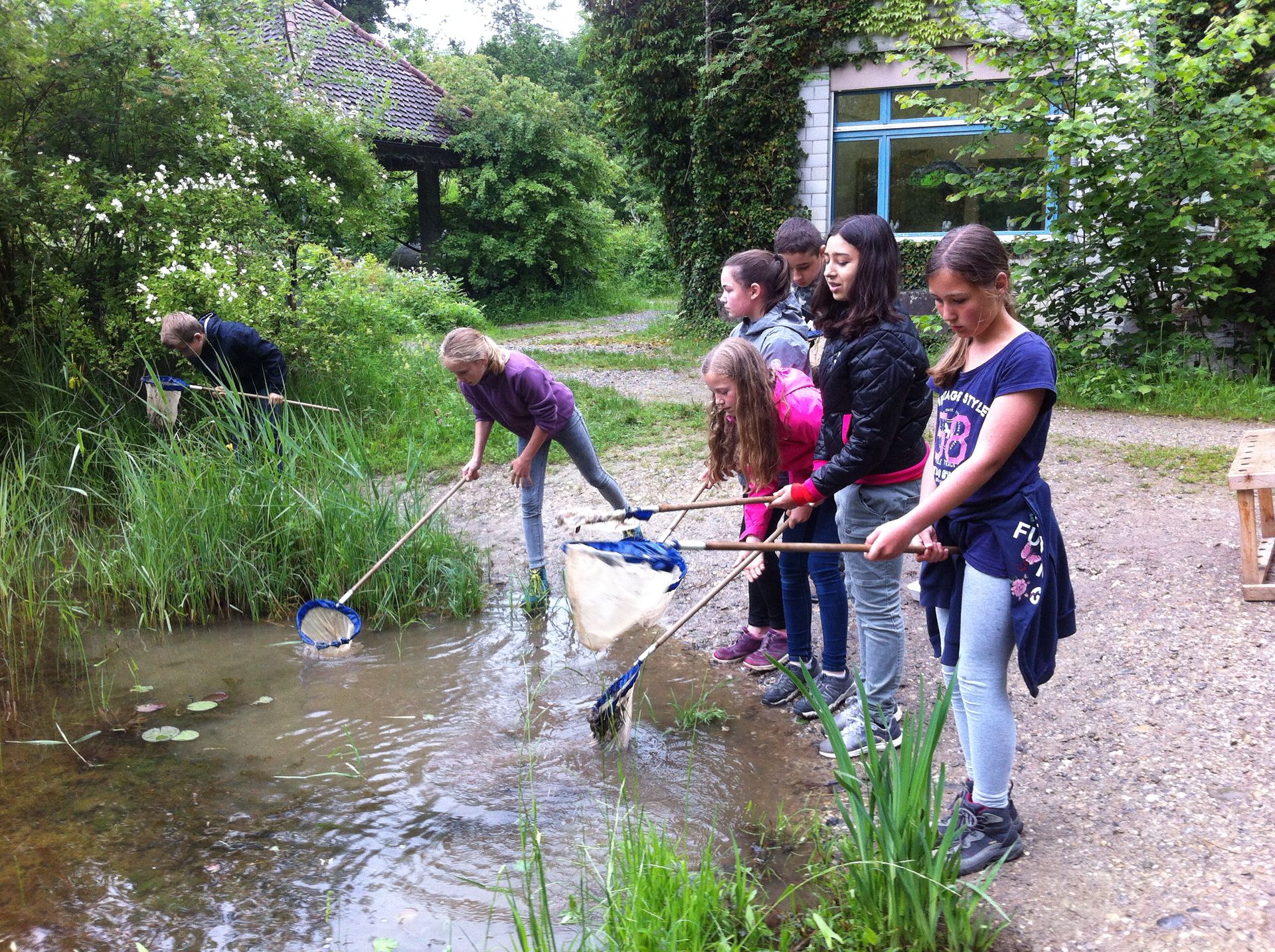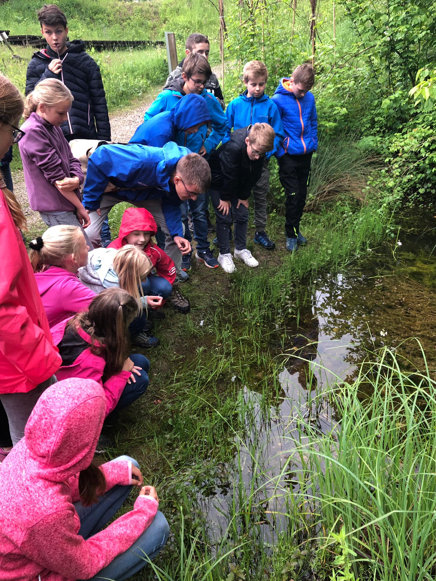 Die 5. Klasse reiste bei kühlen Temperaturen zum Naturlehrgebiet Buchwald. Der Lebensraum Teich gab für die Schülerinnen und Schüler viel zu entdecken, beobachten und erforschen. Auf einem Rundgang entlang von Teichen, Tümpeln und Weihern tauchten sie ein in die Welt der Tiere und Pflanzen am und im Wasser. Dann kehrten sie zurück zum Turm, in dessen Umgebung das Fangen, Beobachten und Freilassen von Wassertieren unter Aufsicht erlaubt war. Natürlich durfte auch der Frosch nicht fehlen.