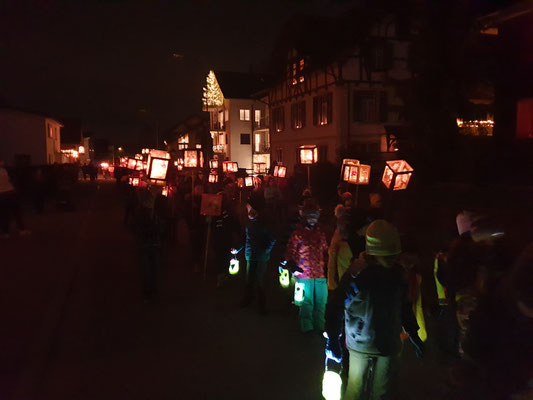 Wenn die Strassenlampen in der Unterdorfstrasse ausgehen und die Trycheln erklingen, ist dies das Startzeichen für den Samichlauseinzug. Hinter dem Geläut marschieren die Kinder rythmisch mit ihren selbstgebastelten und schönen Laternen, die Fackelträger und den grossen Iffelen mit. Die Schülerinnen und Schüler leuchten dem Samichlaus, seinen Eseln und seinem Gefolge den Weg zur Kirche.