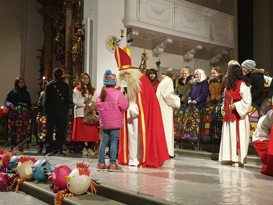 In der gutgefüllten Kirche begrüsst der Pfarreileiter Markus Kuhn die Anwesenden. Der Samichlaus freut sich über die Anwesenheit der Kinder und erzählt ihnen eine Geschichte. Die Schülerinnen und Schüler von Kindergarten bis zur 6. Klasse singen dem Samichlaus die zwei Lieder "Lieber guter Nikolaus, höre doch" und "Lasst uns froh und munter sein" vor. Sowohl der Kindergarten als auch die 1./2. Klasse tragen ihm ein Samichlausversli vor. Der Samichlaus dankt den Klassen mit einem grossen Lebkuchensack. Herzlichen Dank lieber Samichlaus.