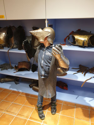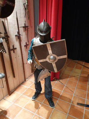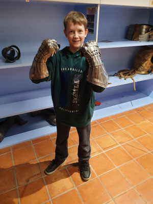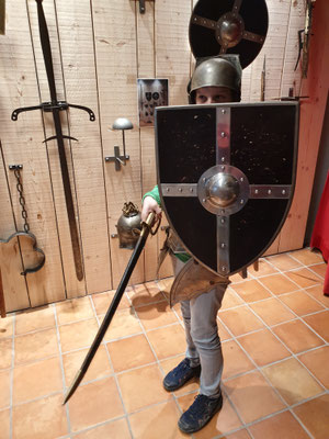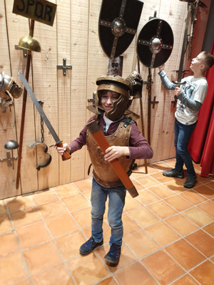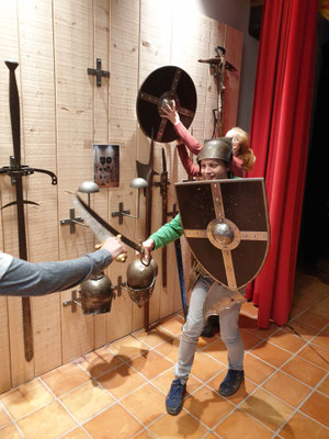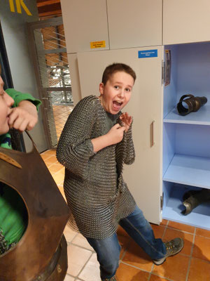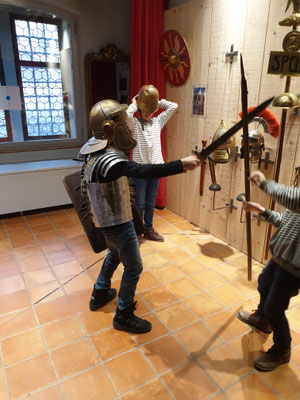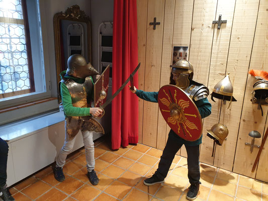 Zuerst arbeiteten die Schülerinnen und Schüler in zwei Gruppen. Die eine durfte sich die Rüstungen und Bekleidung der Römer und der Ritter anziehen und einmal spüren, wie es denn so in diesen Zeiten war. Schnell kamen die Lernenden ins Spielen, das Kämpfen mit den Schwertern und dem Schutzschild musste natürlich sein. So griffen die Römer die Ritter aus dem Mittelalter an. Die andere Gruppe machte sich mit dem Tablet auf die Suche der römischen Gegenstände im Schulhaus. Wer das Quiz mehrheitlich gut gelöst hatte, durfte eine Prägemünze als Preis entgegennehmen.