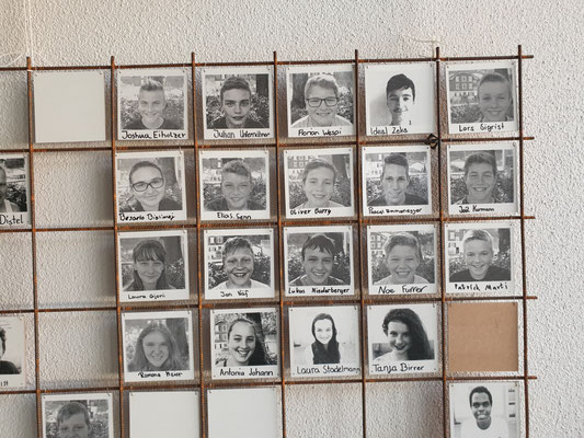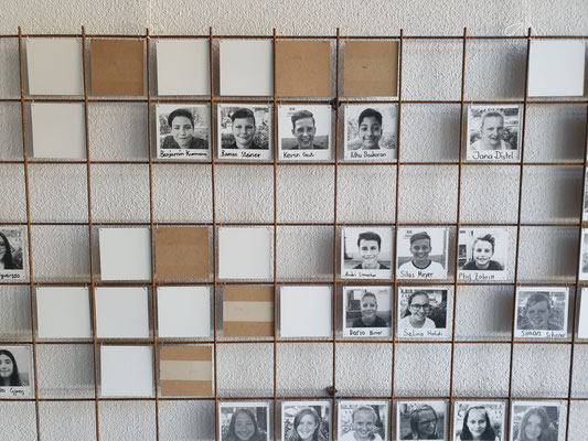 Danach gingen die Schülerinnen und Schüler mit ihren Lehrpersonen zurück ins Sekundarschulhaus. Im Eingangsbereich entsteht jeweils das Gesicht der Sekundarschulgemeinschaft. Die Schülerinnen und Schüler positionierten sich mit ihrem Portrait an einem Gitter. Die genaue Stelle wählten sie selbst aus. Auch die neuen Lernenden reservierten sich bereits ihren Platz, das Portrait entsteht in den kommenden zwei Wochen.