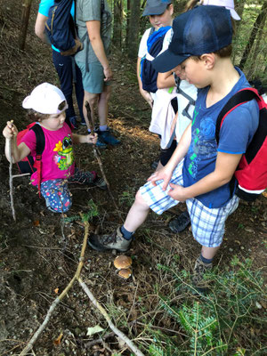 Nach einem kurzen Input im Schulzimmer zum Thema Wald (Schwerpunkt in diesem Schuljahr) wanderte die Basisstufe und die 3.-6. Klasse bei schönstem Wetter zum Oberlehn, dann Richtung Krautschütte und schliesslich zum Picknickplatz Ober-Alpetli. Gemeinsam oder in altersgemischten Gruppen gab es viel im Wald und auf dem Weg zu entdecken. Die Kinder fanden zum Beispiel Rehplätze, machen ein Ameisenexperiment, versuchten einige Bäume und Sträucher zu bestimmen und fanden neben imposanten Baumpilzen zum Glück auch essbare Steinpilze.
