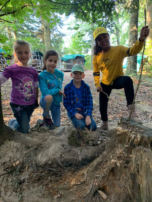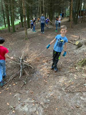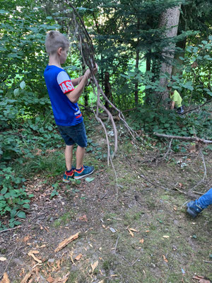 Zuerst verbrachten wir Zeit mit freiem Spielen im Wald. Dabei entdeckten wir grosse Pilze, transportierten schwere Äste mit unseren Seilen und lauschten den unbekannten Geräuschen.