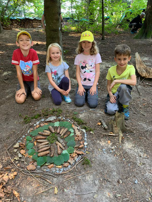 In der Pause schmolzen weisse Marshmallows über dem Feuer und verklebten uns den Mund J Auch das obligate Znüni aus dem Rucksack durfte nicht fehlen. Als wir genug gestärkt waren, wurden wir zu kleinen Künstlerinnen und Künstler. Es entstanden wunderschöne Naturmandalas, welche wir dann stolz präsentieren konnten.