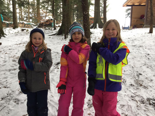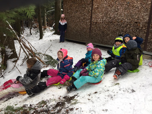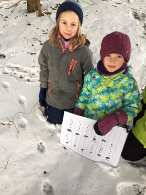 Die 1./2. Klasse A verschob im Wald ganze Baumstämme, ging den Tierspuren im Schnee auf den Grund und vergnügte sich mit dem Füdlibob.