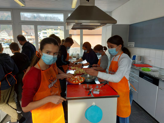 Die Freude am Kochen, Essen und Geniessen konnte so bei den Schülerinnen und Schülern geweckt werden. Mit weniger Freude verbunden aber trotzdem wichtig war nach dem Mittagessen das Abwaschen, Abtrocken und Reinigen der Küche.