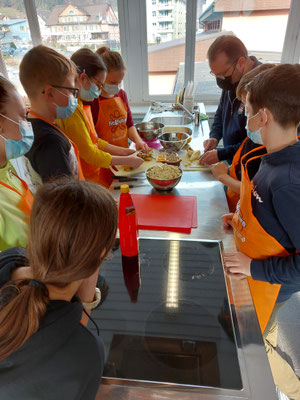 Die 6. Klasse Menznau durfte bei diesem KiKo (Kinderkochen von Fit4Future) am 9. März 2021 tatkräftig mithelfen. Nach einer kurzen Theorie im Schulzimmer zur Nahrungsmittelpyramide und den saisonalen und regionalen Nahrungsmittel ging es für die Klasse in die Schulküche. In drei Gruppen bereiteten die Kinder das Znüni und das Mittagessen zu. Die Gruppen schnitten Gemüse in Stangen, mischten Dips, fertigten Fruchtspiessli an, kochten Reis und Currysauce, brieten Tofu an, würfelten Früchte und bereiteten ein feines Schichtdessert zu.