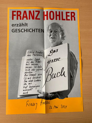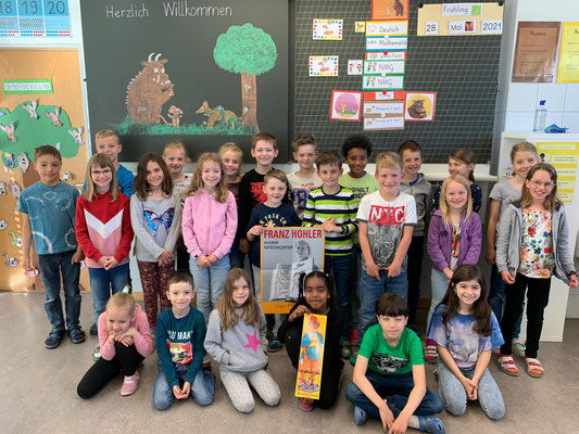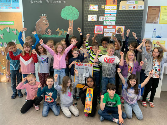 Die Kinder der 1./2. Klasse B staunten nicht schlecht, als sie von Franz Hohler Post erhielten. Auf einem grossen Plakat dankt er den Kindern für die vorgetragenen Verse. Als Geschenk der Wertschätzung schickte er seine Werk "Der gross Zwärg" mit Texten und Liedern von ihm mit. Gespannt hören sich die Kinder nun die Geschichten und Lieder an. Das Schmunzeln kann man sich bei diesen tollen Texten schon nicht ganz verkneifen. Ein ganz dickes Dankeschön für Ihre grosse Überraschung Herr Hohler.