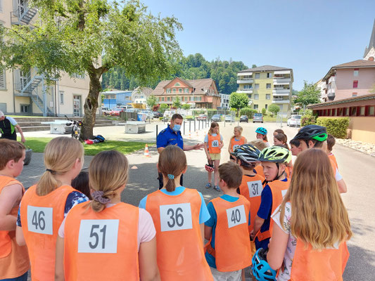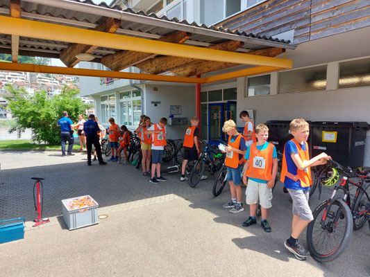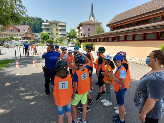Der praktische Fahrradtest fand am 18. Juni 2021 statt. Zuerst wurden von den Polizisten die Fahrräder auf ihre Fahrtüchtigkeit und die obligatorischen Bestandteile kontrolliert. Während dessen erklärte der Verkehrsinstruktor den Kindern noch einmal die wichtigsten Strassenregeln.