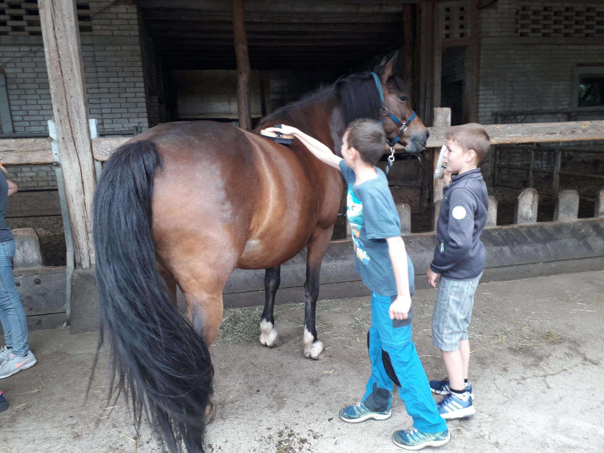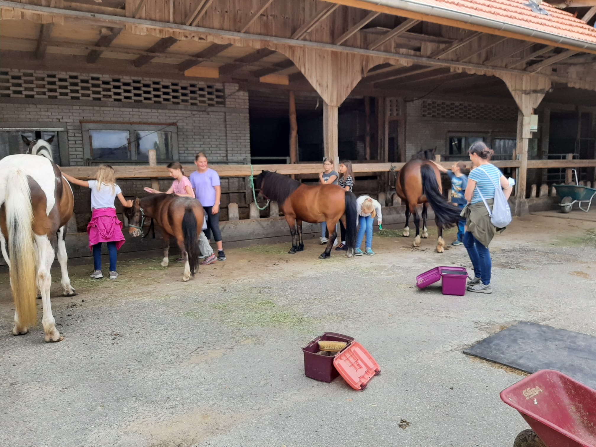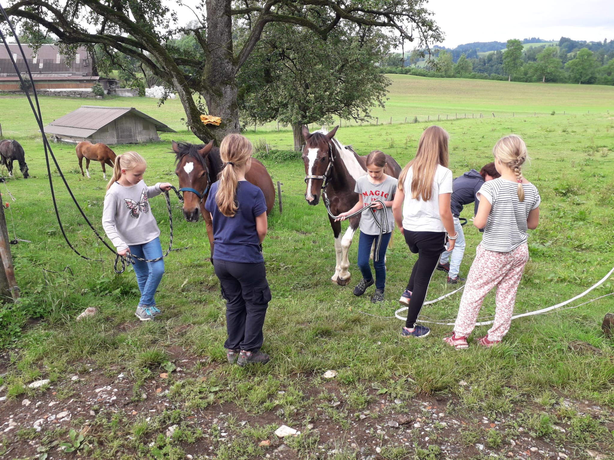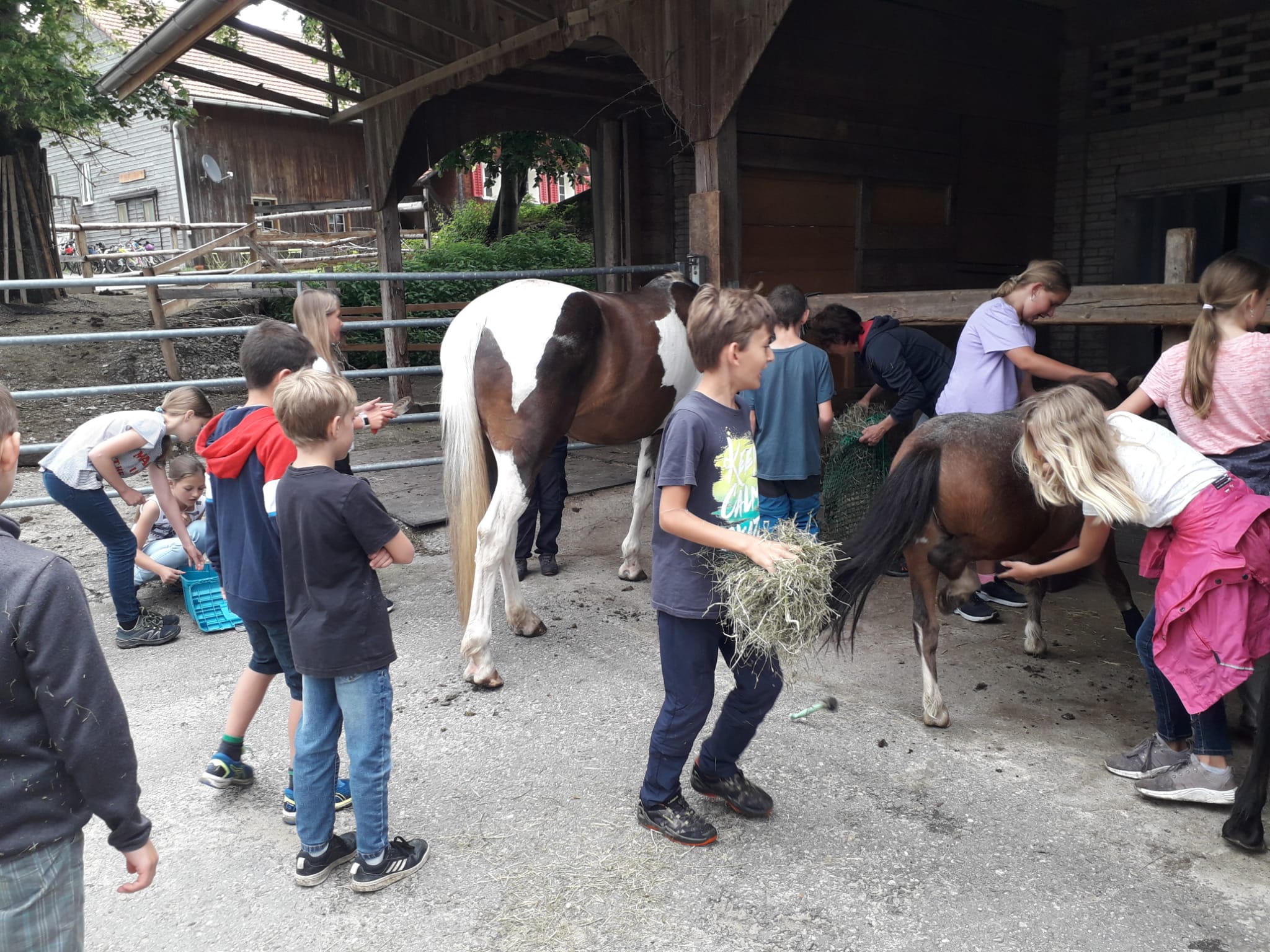 Mit dem Fahrrad fuhren die Schülerinnen und Schüler der 3./4. Klasse Geiss über den Weiler Wermelinger auf Feldwegen der Gemeindegrenze entlang bis zum Tropenhaus. Auf dem Hof Hiltenberg lernten die Kinder die Pferde und Ponys kennen, führten und putzten sie. Es hat allen merklich Spass gemacht.