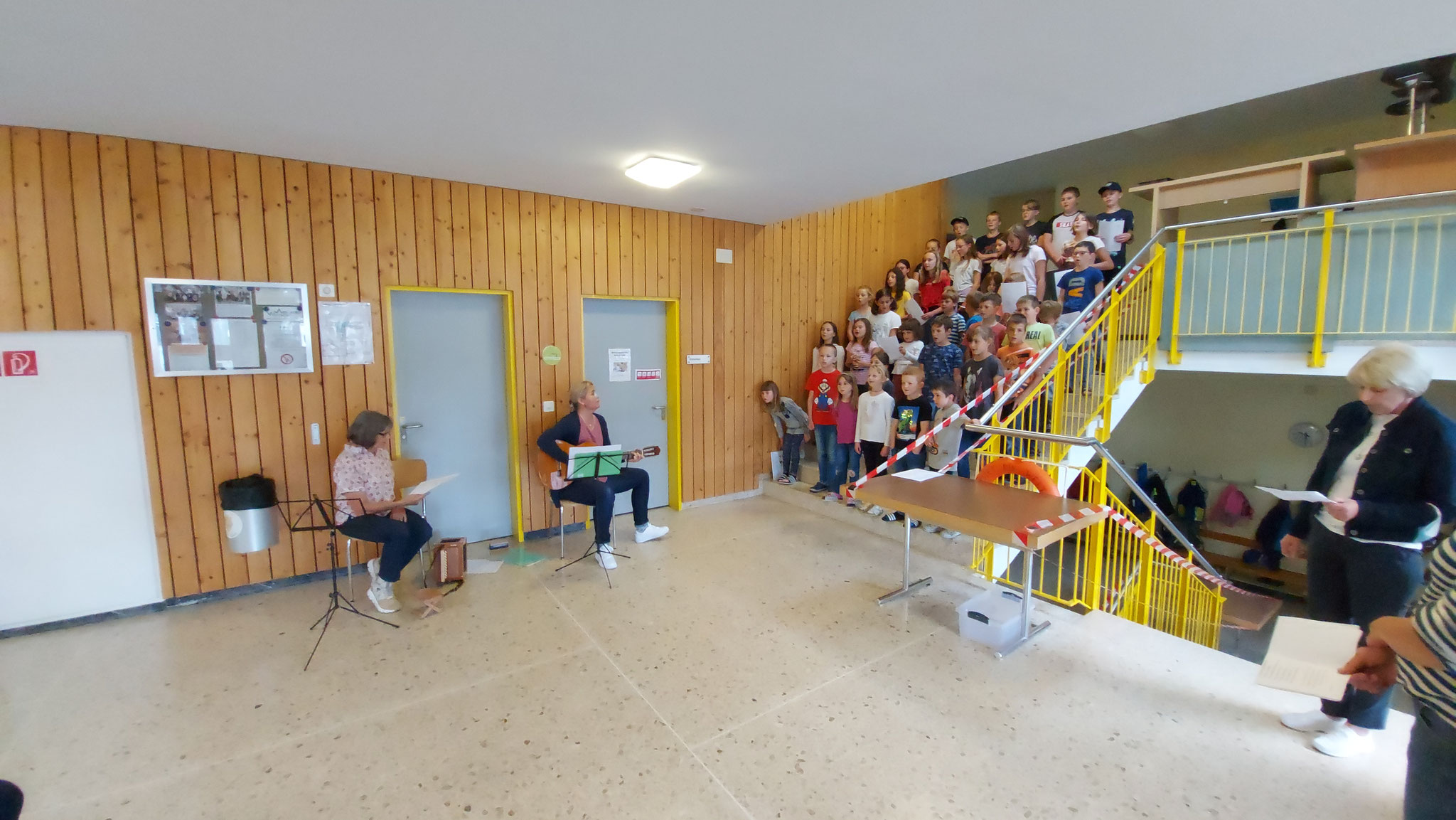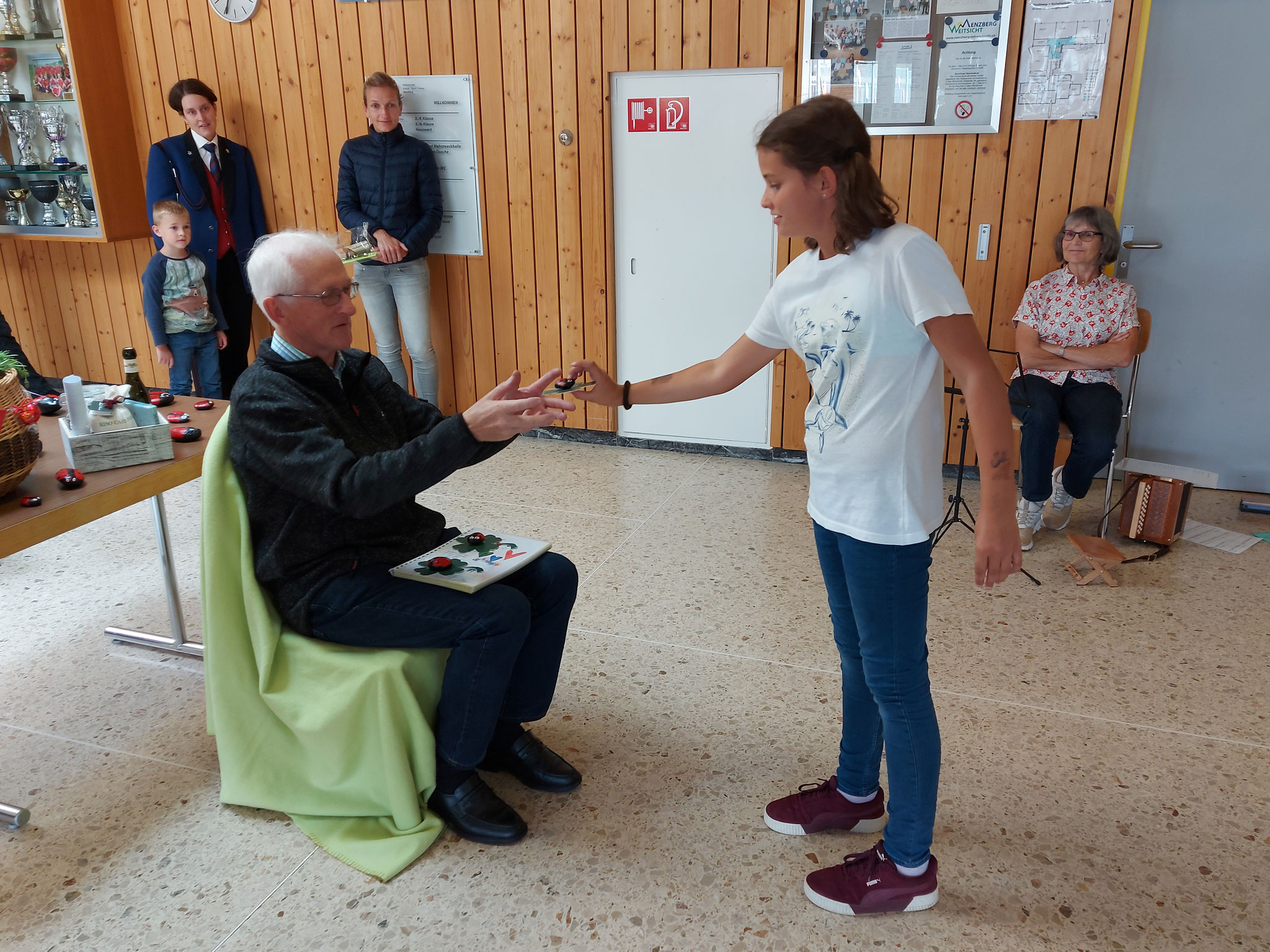 Als Josef Vogel das Schulhaus betrat, spielte Judith Geisshüsler auf dem Akkordeon und Petra Wicki auf der Gitarre. Die Kinder tanzten mit der Lehrperson Sarah Rüssli dazu. Josef Vogel nahm auf seinem extra bereitgestellten Stuhl Platz und bewunderte das fröhliche Treiben. Mit einer Melodie von ABBA und einem selbstverfassten Text trugen die Kinder und Lehrpersonen ein herzallerliebstes Lied mit folgendem Refrain vor: