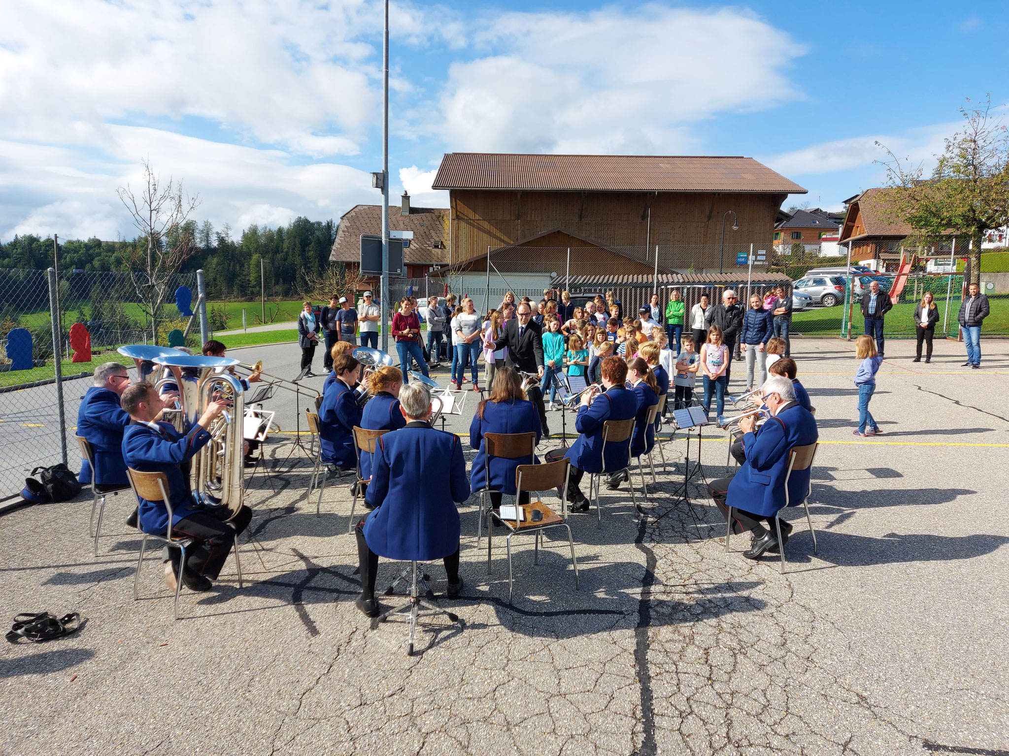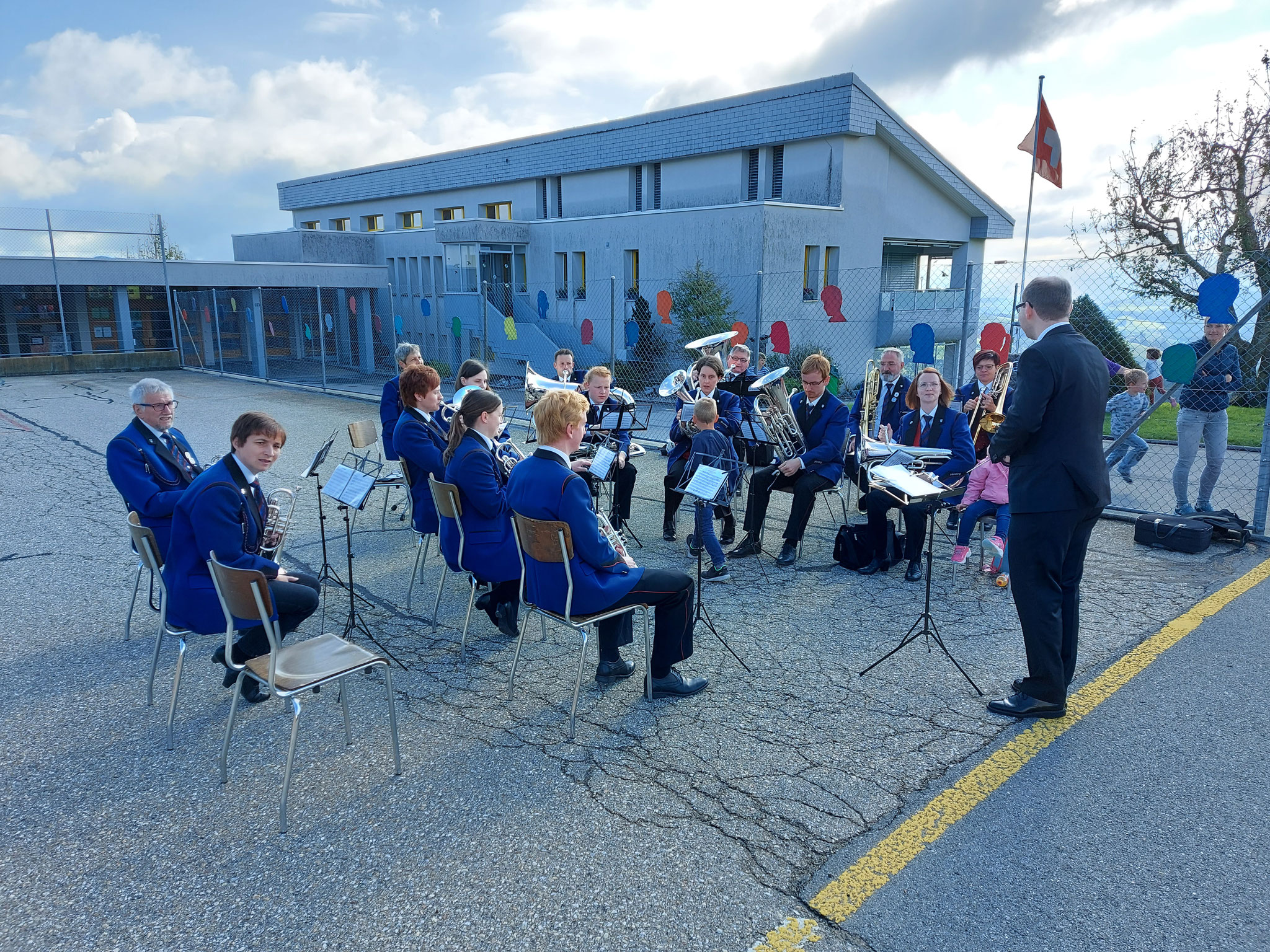 Mit dem Deutz-Traktor trat er nun seinen letzten Schulweg zum Schulhaus an. Unter tosenden Applaus, jubelnder Menge und wohlklingenden Tönen der Musikgesellschaft Menzberg fuhr er auf dem Schulhausplatz ein. Er durfte dem Ständchen der Musikgesellschaft lauschen und geniessen. Alle Anwesenden trafen sich um den Traktor herum zum obligaten Foto. Zwar war dieses nicht coronakonform, doch das war ja am letzten Schultag auch egal.