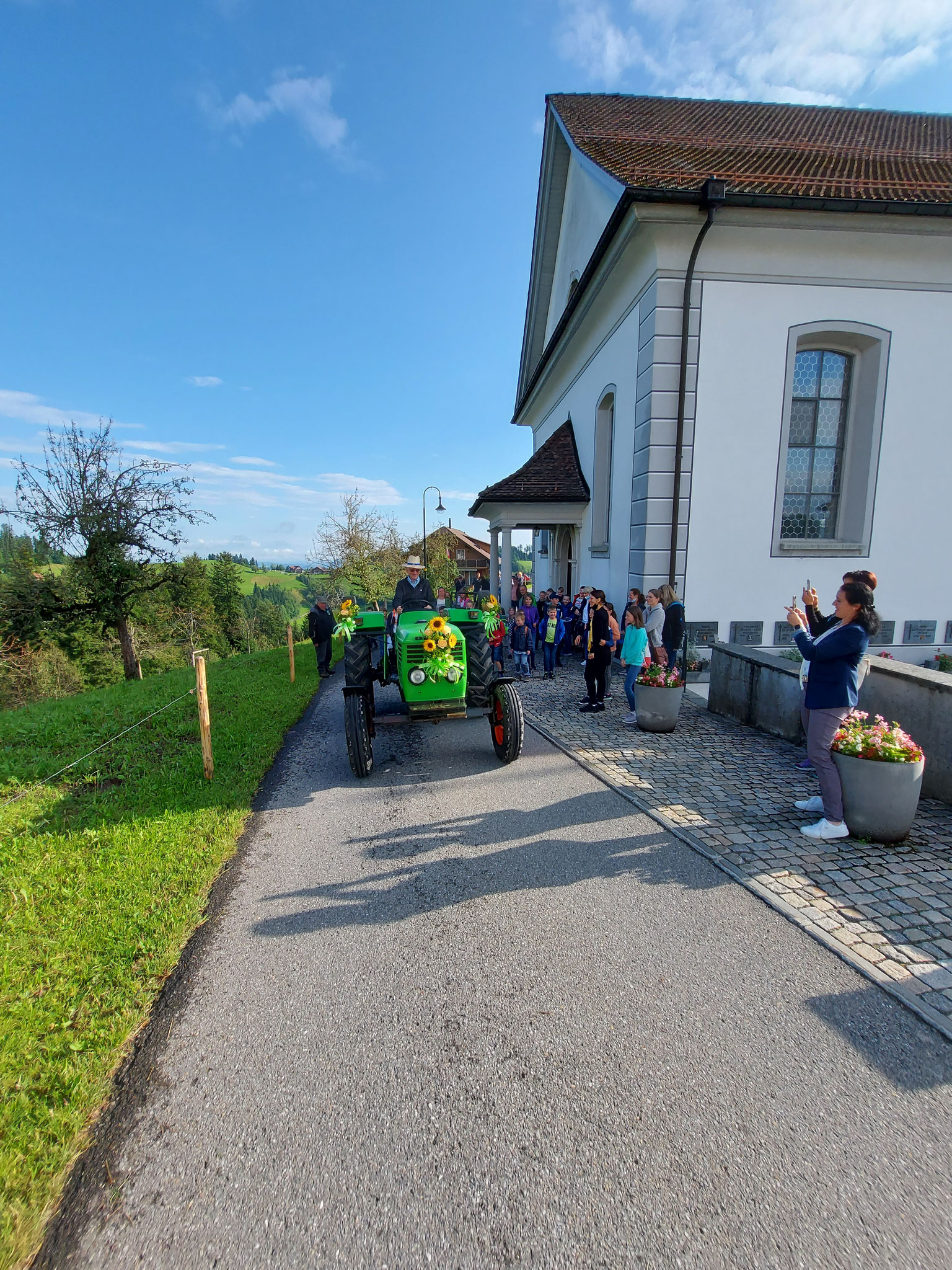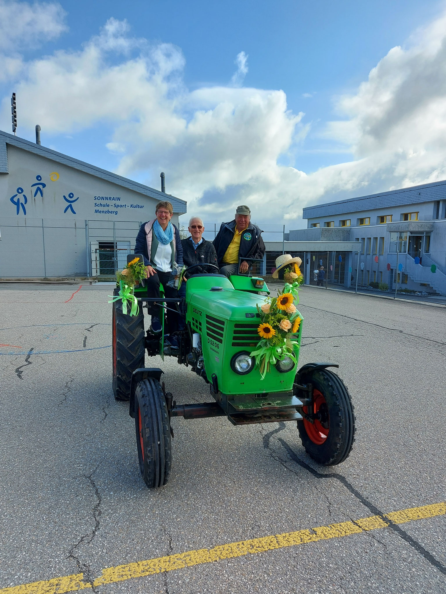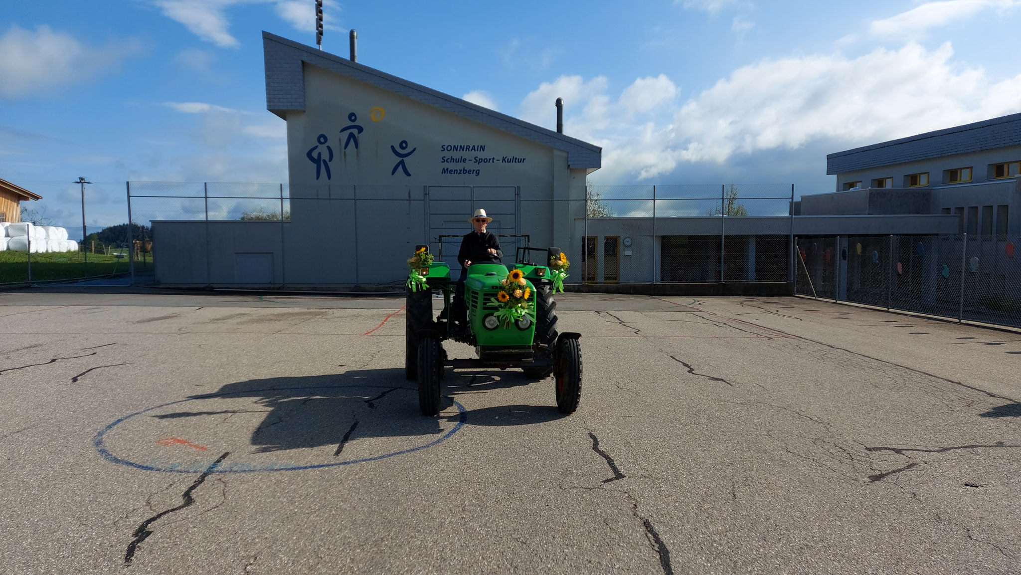 Einen besonderen letzten Schultag durfte die Klassenlehrperson Josef Vogel nach 37 Jahren Unterrichtstätigkeit erleben. Mit der Schulschlussfeier in der Kirche begann der letzte Schultag wie jedes Jahr im Menzberg. Als dann aber die Gesamtschulleitung in der Kirche das Wort erhielt, nahm der Tag für Josef Vogel eine ganz andere Wendung. Seinen letzten Gang zum Schulhaus war etwas Besonderes. Vor der Kirche stand sein Lieblingstraktor für eine Ausfahrt bereit - ein alter grüner Deutz von Werner Fellmann. Nach einer kurzen Einführung ertönte der schnurrende Motor. Zuerst musste der Traktor in Fahrtposition manövriert werden. Werner Fellmann setzte Josef Vogel noch den passenden Hut auf. Bei der Abfahrt Richtung Dorf winkten ihm alle Kinder, Eltern, Lehrpersonen und seine Familie zu. Einige Kinder sprangen ihm bis zum Kurhaus hinterher.