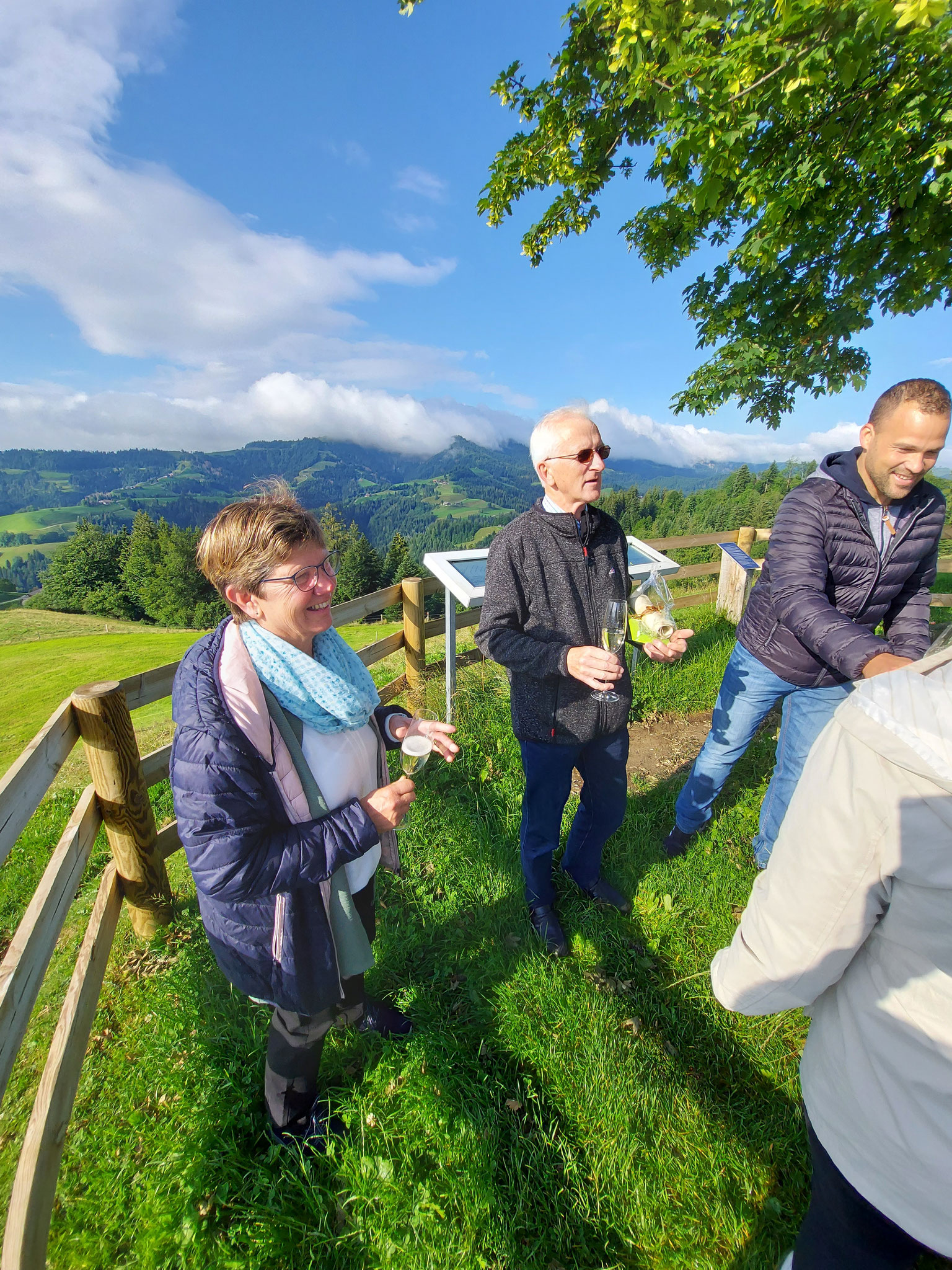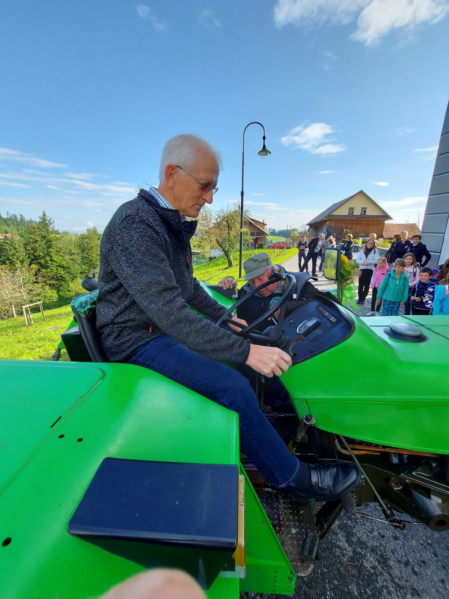 Gemütlich ratterte Josef Vogel davon. Auf der Strasse zum Oberlehn durfte er aufmunternde Wünsche seiner Tochter lesen. Den, durch einen Windstoss, verlorenen Hut sammelte das nachfahrende Auto ein. Beim Aussichtpunkt wartete schon die Bildungskommission mit einem kleinen Apéro und einem Geschenk. Natürlich gab es alkoholfreien Sekt, schliesslich trinkt man ja auch nicht beim Fahren. Josef Vogel erklärte die Berge, Höfe und Dörfer, welche zu sehen waren.