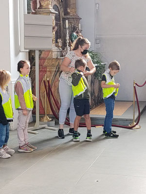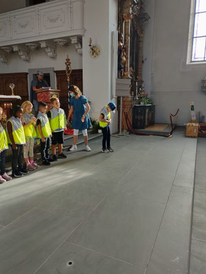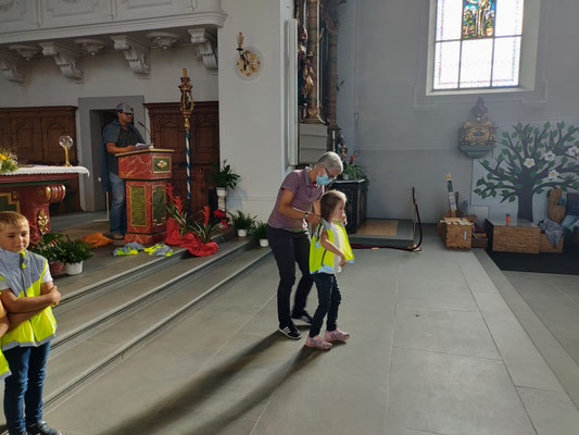 Passend zum Thema wurden die Schülerinnen und Schüler der 1. bis 6. Klasse mit ihren Lehrpersonen sowie zahlreichen Eltern in der Kirche mit der bekannten Titelmelodie aus dem Tatort begrüsst. Die Detektive Colombo (Katechetin Denise Heiniger) und Adrian Monk (Katechetin Claudia Reis-Reis) mussten zu Beginn der Feier den Anwesenden leider mitteilen, dass der Schulleiter Remo di Monaco entführt worden sei und irgendwo in der Kirche versteckt wird. «Ich habe den Schulleiter! Folgt den Hinweisen, wenn ihr ihn wiederhaben wollt!» Diese Aufforderung haben die Detektive erhalten und mit der Hilfe der Kinder, konnte des notwendige Lösungswort ermittelt werden. Einige mutige Schüler stiegen auf den Turmbalkon und fanden ein Teil eines Skeletts sowie den Schulleiter. Froh über seine Befreiung feierten die Schülerinnen und Schüler und formten das Motto von «Tatort» zu «Ort der guten Tat» um. Die Katechetin meinte, «Danke und Bitte sagen jeden Tag, sind schon ein guter Anfang zu einer guten Tat.»