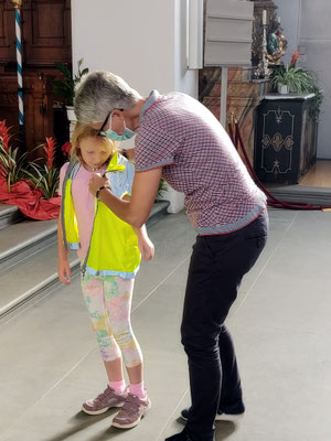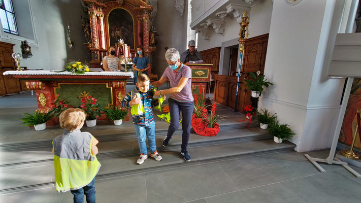 Tatkräftig begrüsste nun der befreite Schulleiter die 1. Klässler persönlich und jedem wurde seine Leuchtweste übergeben. Und ja, man nimmt an, dass der Entführer der Sakristan war!