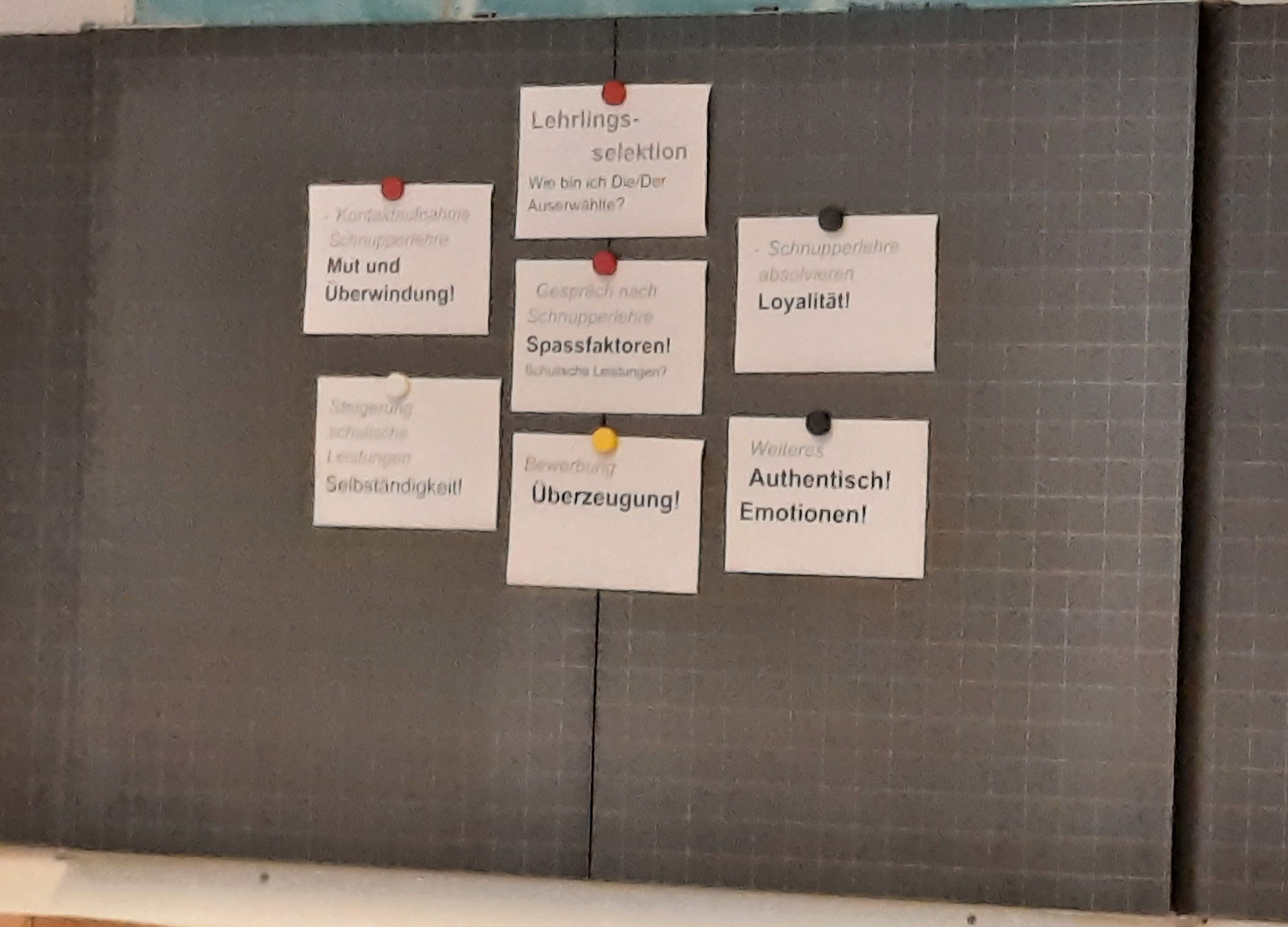 Wie bin ich DIE/DER Auserwählte? Diese Frage stellte Manuel Bürkli ins Zentrum. Die Kontaktaufnahme braucht sicher Mut und Überwindung, aber die Betriebe schätzen das Interesse der Jugendlichen. Mit einer guten Schnupperlehre und einer sorgfältigen Bewerbung kann man überzeugen. Zudem hilft es auch, wenn man als Person authentisch ist und positive Emotionen wecken kann.