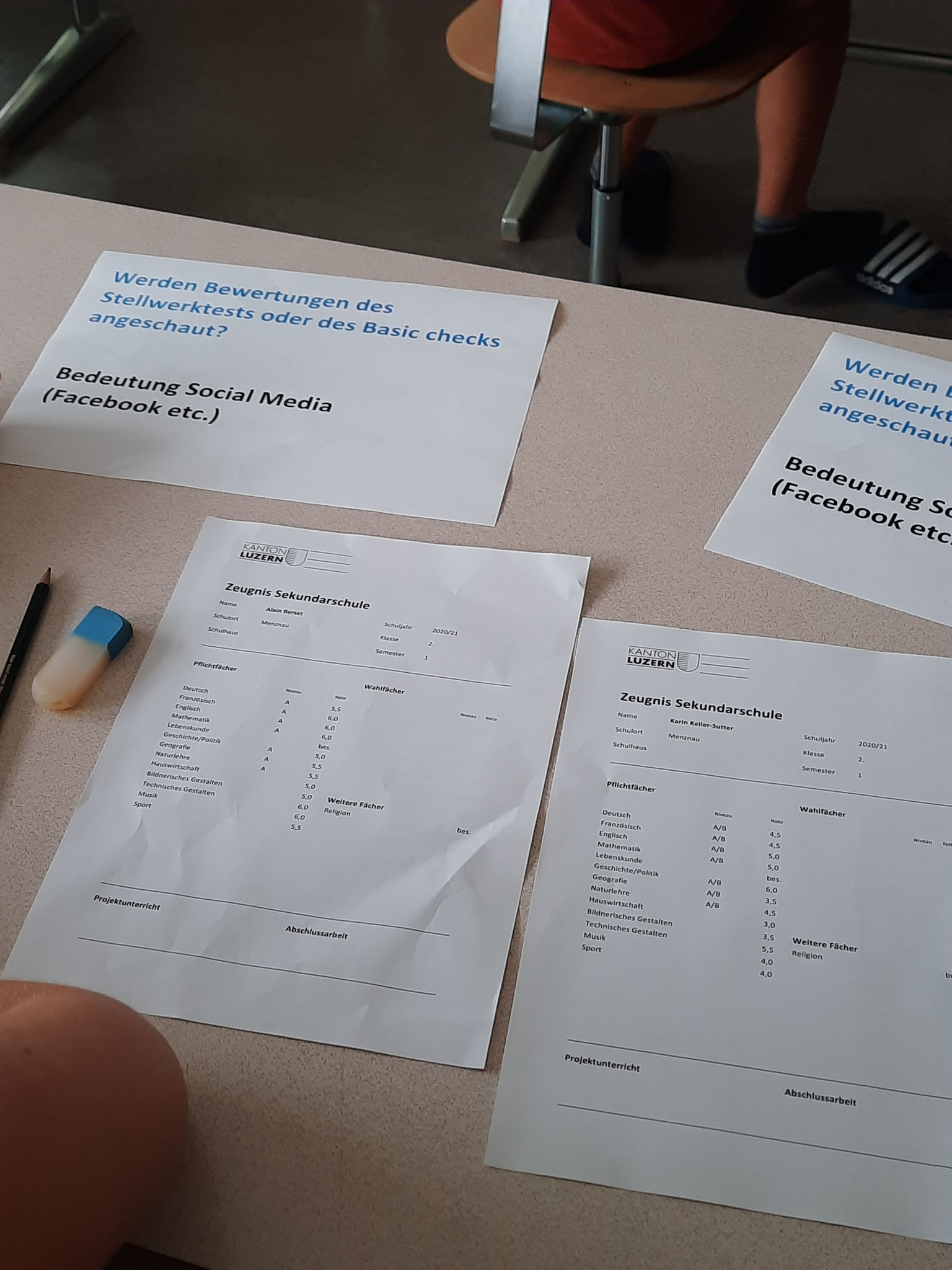 Oliver Grossmann wies darauf hin, dass das Betrachten des Zeugnisses einen Eindruck hinterlasse, ob man wolle oder nicht. Er sensibilisierte die Schülerinnen und Schüler für die Schwierigkeiten im Umgang damit. Im Anschluss konnten die Lernenden gerade selbst aktiv werden und drei fiktive Zeugnisse miteinander vergleichen. Es wurde schnell einmal klar: Es geht nicht nur um die Noten. Zudem fliessen in die Beurteilung auch die Resultate des Stellwerk-Checks ein.