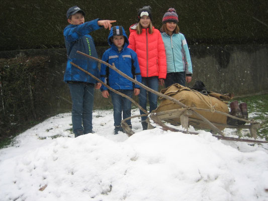 Die 3.-6.Klasse Menzberg arbeitet praktisch am Maultier Nora mit dem Packmaterial von damals: etwa 1830 über den Gotthard. Das alte, schwere Material liegt schwer in den Händen der Schülerinnen und Schüler. Geübte, jüngere Schülerinnen zeigen den grossen, wie ein Maultier für das Säumen vorbereitet werden muss. Das ist Säumen über den Menzberg.