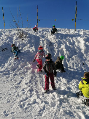 Die andere Gruppe reiste mit dem Car nach Sörenberg, ausgestattet mit Skiern, Bob oder Schlitten. Dort angekommen wurden die Kinder ihrem Niveau entsprechend in Gruppen eingeteilt. Mit den Begleitpersonen ging es dann ab auf die Piste. Um die Mittagszeit trafen alle im Restaurant Schwand ein und wurden mit einem feinen Menu erwartet. Gestärkt und erholt flitzten die Kinder anschliessend die Piste herunter und fuhren bei herrlichem Sonnenschein und guten Schneeverhältnissen bis um 15.30 Uhr.