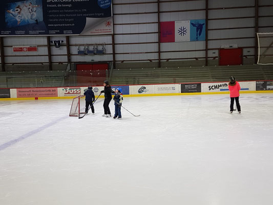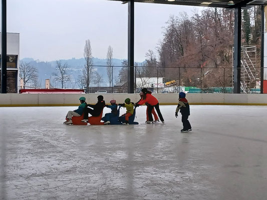 Eine Gruppe reiste mit dem Zug nach Luzern und lief zum Eiszentrum. Dort konnten sich die Kinder auf dem Eis so richtig austoben. Mithilfe der „Gleit-Robben“ konnten alle sicher über das Eis gleiten oder sich transportieren lassen. Zwischendurch konnten sich die Kinder im Restaurant stärken und sich aufwärmen, bevor es wieder aufs Eis ging. Beim Eishockey Spiel wurde der Wettkampfgeist geweckt.